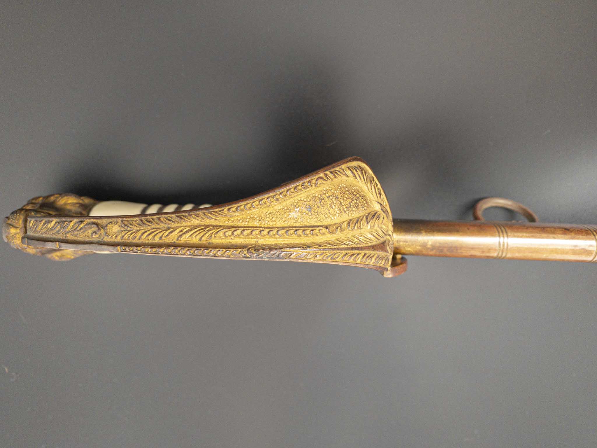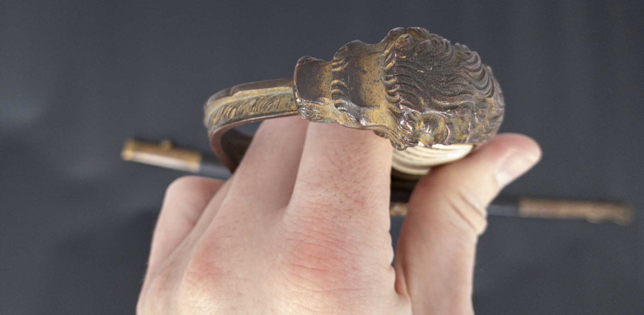 Эфес сабли состоит из рукояти и гарды, детали эфеса позолочены. Рукоять пластмассовая белого цвета, c выпуклым брюшком, обвита по желобкам крученой проволокой. Спинку рукояти прикрывает латунная планка, выпуклый рельефный орнамент которой имитирует львиную гриву. Планка завершается головкой в виде объёмной головы льва, (данная модель идет без камней в глазах) держащего в пасти дужку гарды. В темени у льва расклёпанный конец хвостовика клинка. В нижней части рукоять перехвачена овальной втулкой с выпуклым орнаментом в виде дубовых ветвей с листьями и желудями.