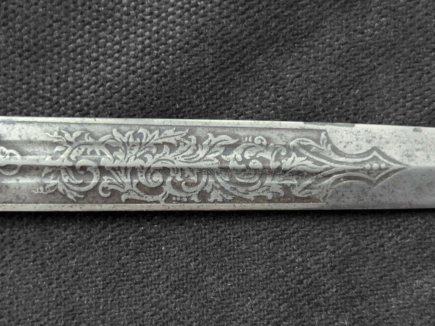 Клинок стальной, прямой, двухлезвийный, с грубым травлением: на морскую тематику с ростковым орнаментом, без клейм.