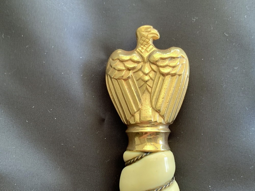 Головка выполнена в виде эмблемы государственного орла со сложенными крыльями и крепит клинок к рукояти.