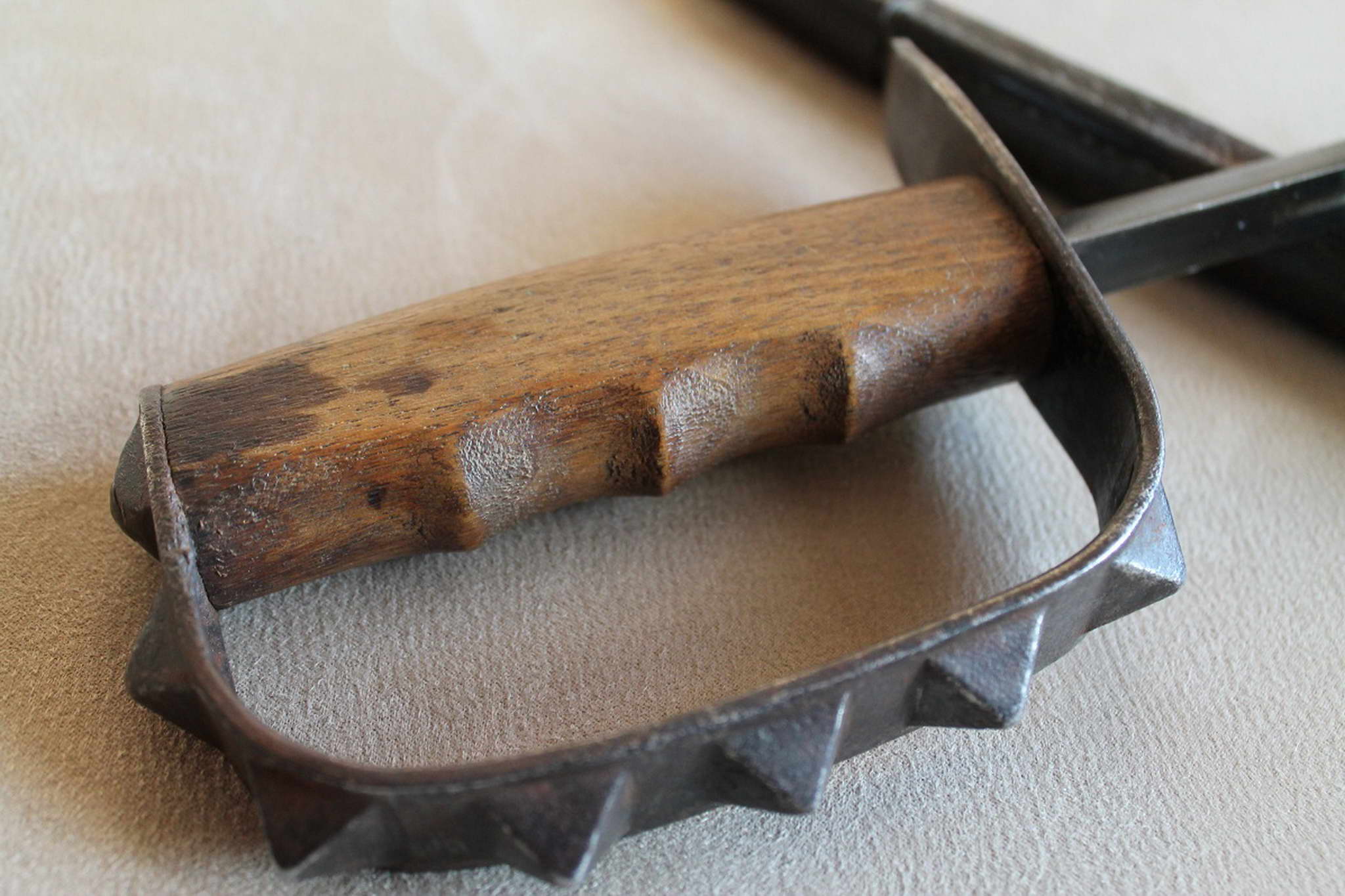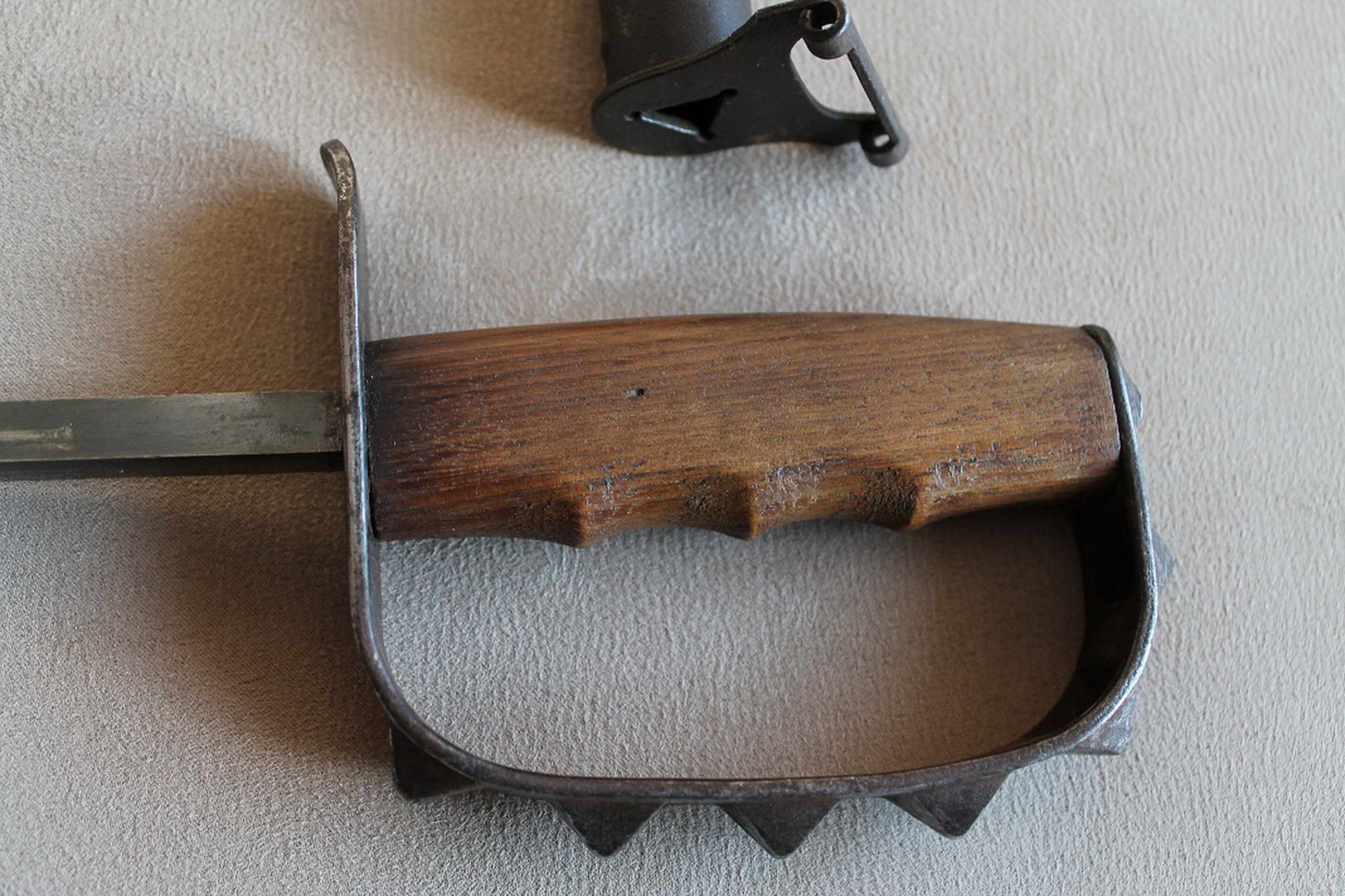 Рукоять из орехового дерева оснащена скобой в качестве гарды, которая жестко соединена с хвостовиком. Благодаря семи граненым выступам рукоятка одновременно является кастетом. Цельная деревянная ручка имела сплошную полукруглую железную гарду с выступающими наружу зубцами, что позволяло наносить сокрушительные удары кулаком. Гарда с клеймом производителя «U.S L.F & C. 1917» (L.F.& C. — Компания, с 1862 года производившая различные предметы домашнего обихода, была куплена General Electric в 1965).
