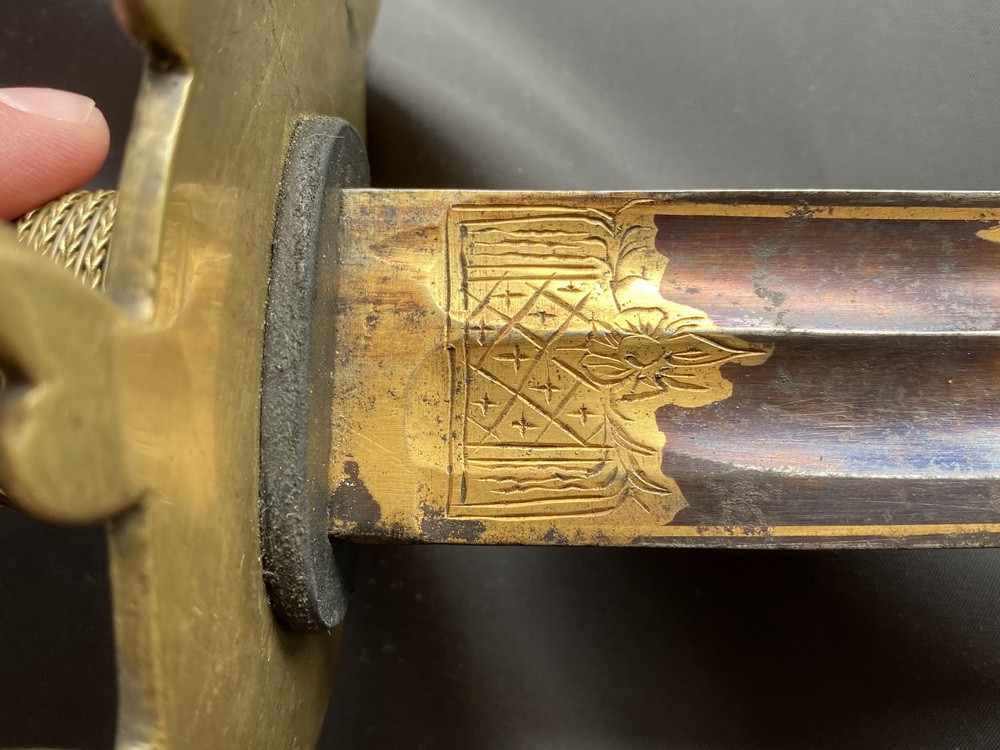 Клинок прямой, однолезвийный, боевой конец двулезвийный, с двумя долами, украшен растительным орнаментом и изображением трофеев, золочением и синением.На обухе клинка иглой нанесена надпись «Manufacture Imp’le du Klingenthal Сoulaux Freres» — клеймо производителя — Королевской мануфактуры в Клингентале. До 1810 года на клинках не ставили датировку.