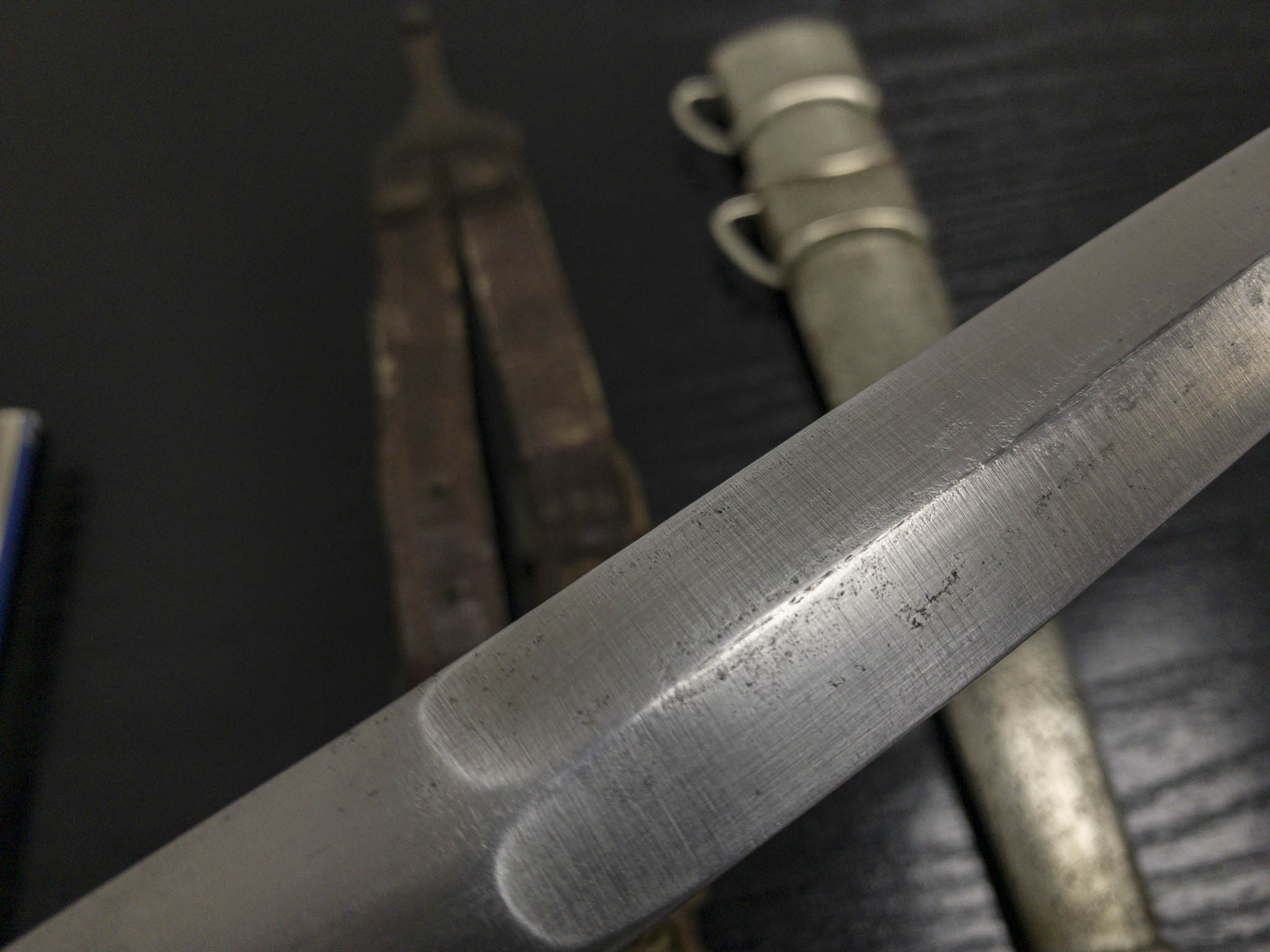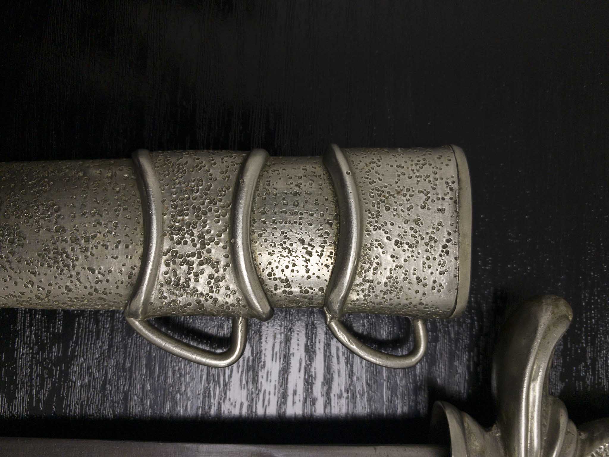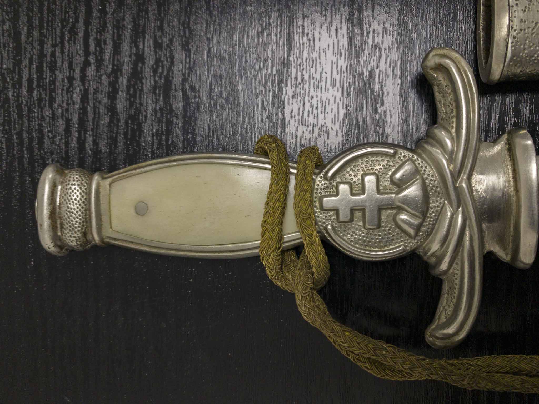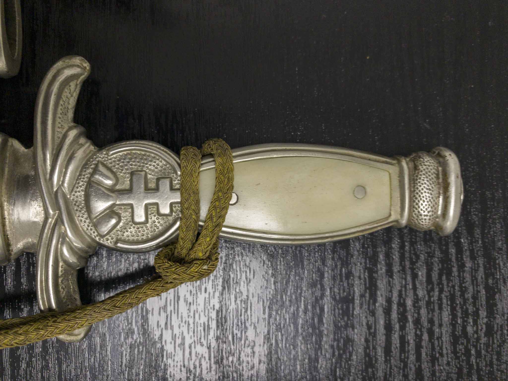 Перед вами редкий и оригинальный кортик для словацкой армии и государственных чиновников образца 1939 года с оригинальным кожаным подвесом и темляком. Обратите внимание на большой словацкий национальный герб над крестовиной и необычный узор с пунктиром на рукоятке и ножнах. В этом примере щечки рукояти выполнены из кости для офицеров.