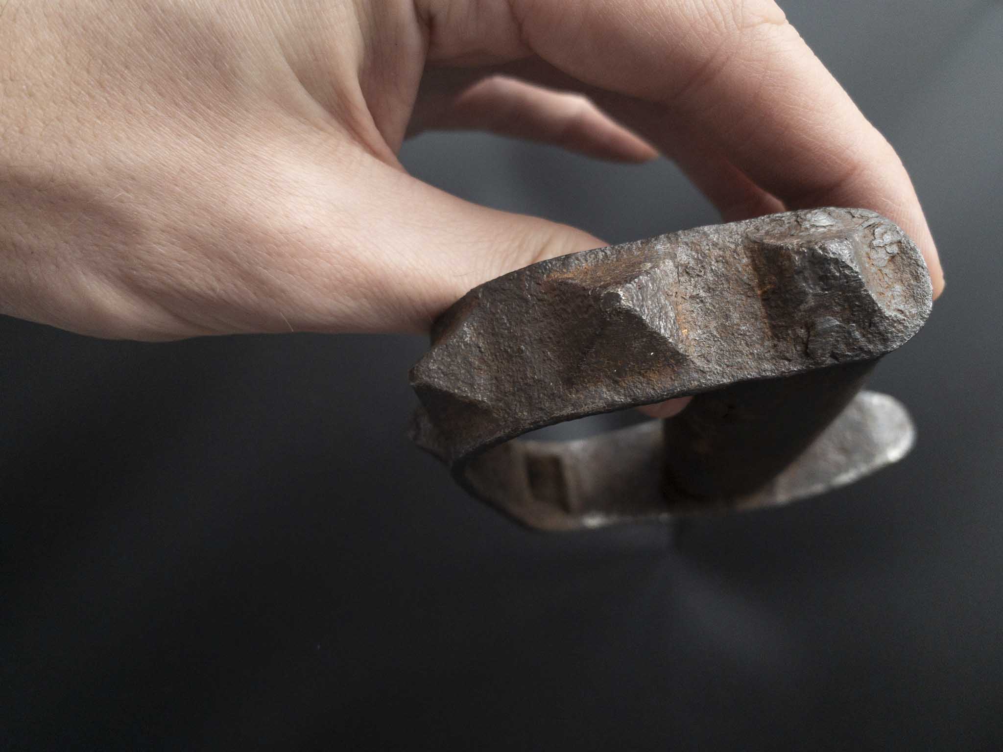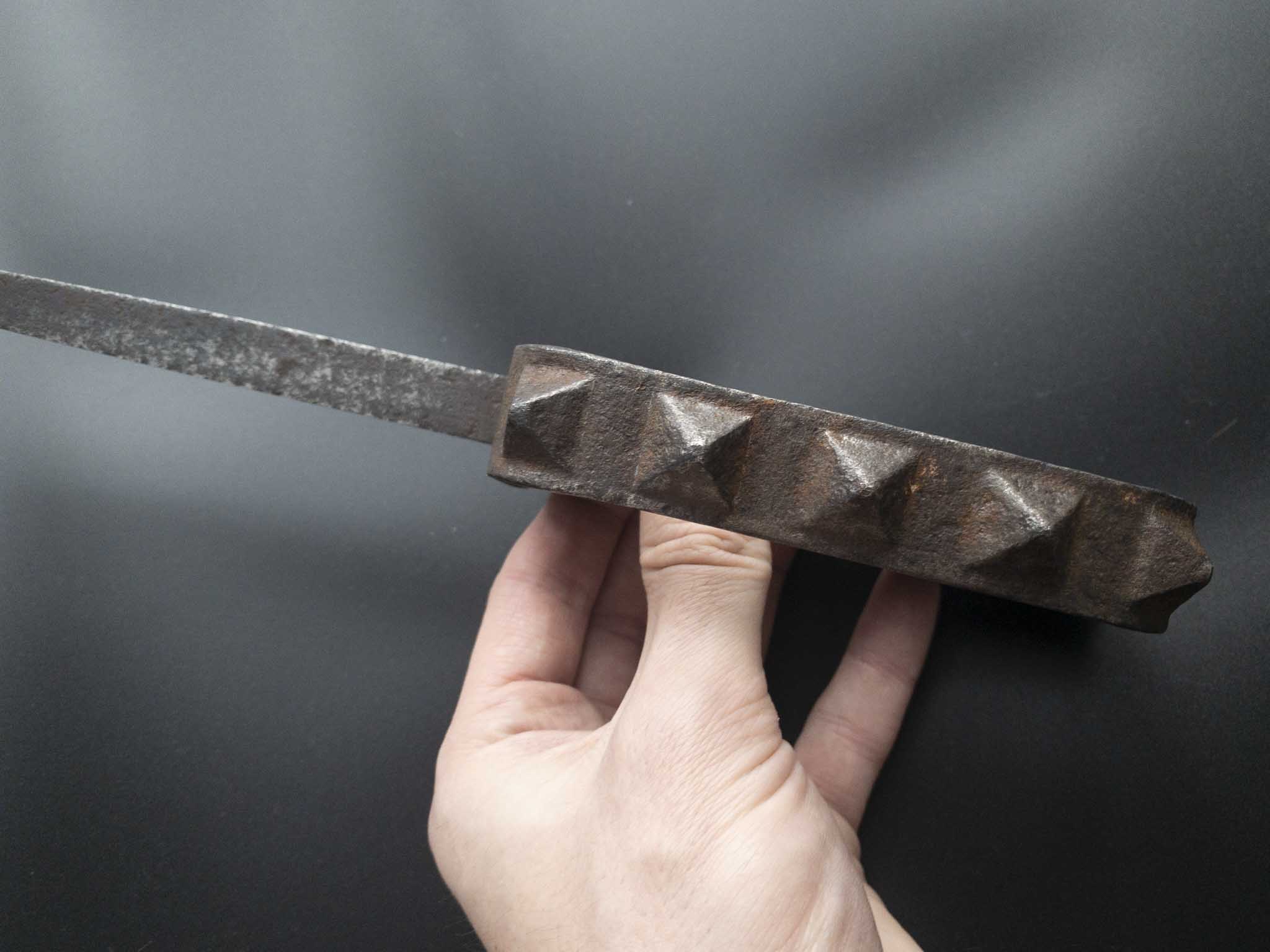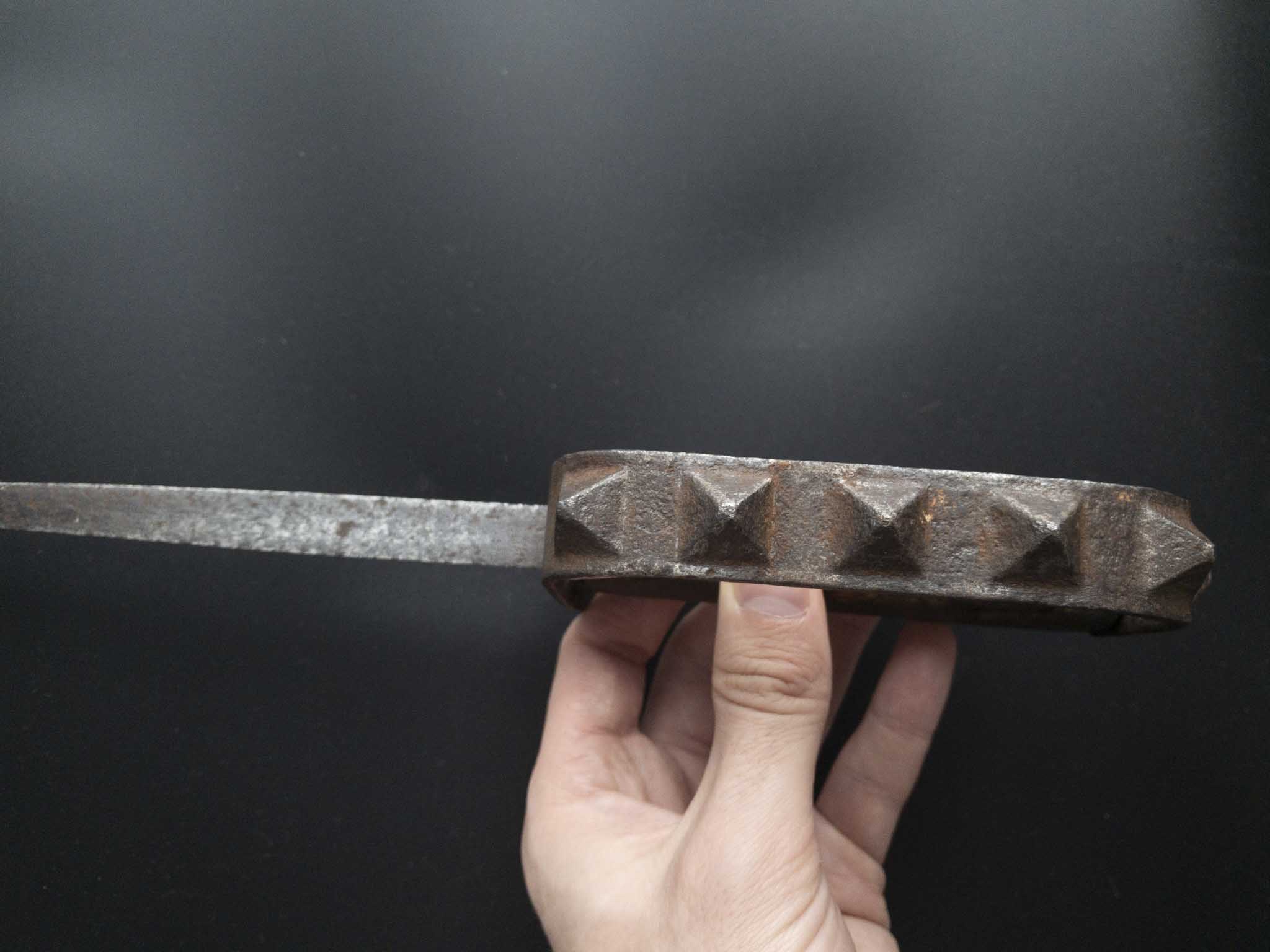 Рукоять из орехового дерева оснащена скобой в качестве гарды, которая жестко соединена с хвостовиком. Благодаря семи граненым выступам рукоятка одновременно является кастетом. Цельная деревянная ручка имела сплошную полукруглую железную гарду с выступающими наружу зубцами, что позволяло наносить сокрушительные удары кулаком.