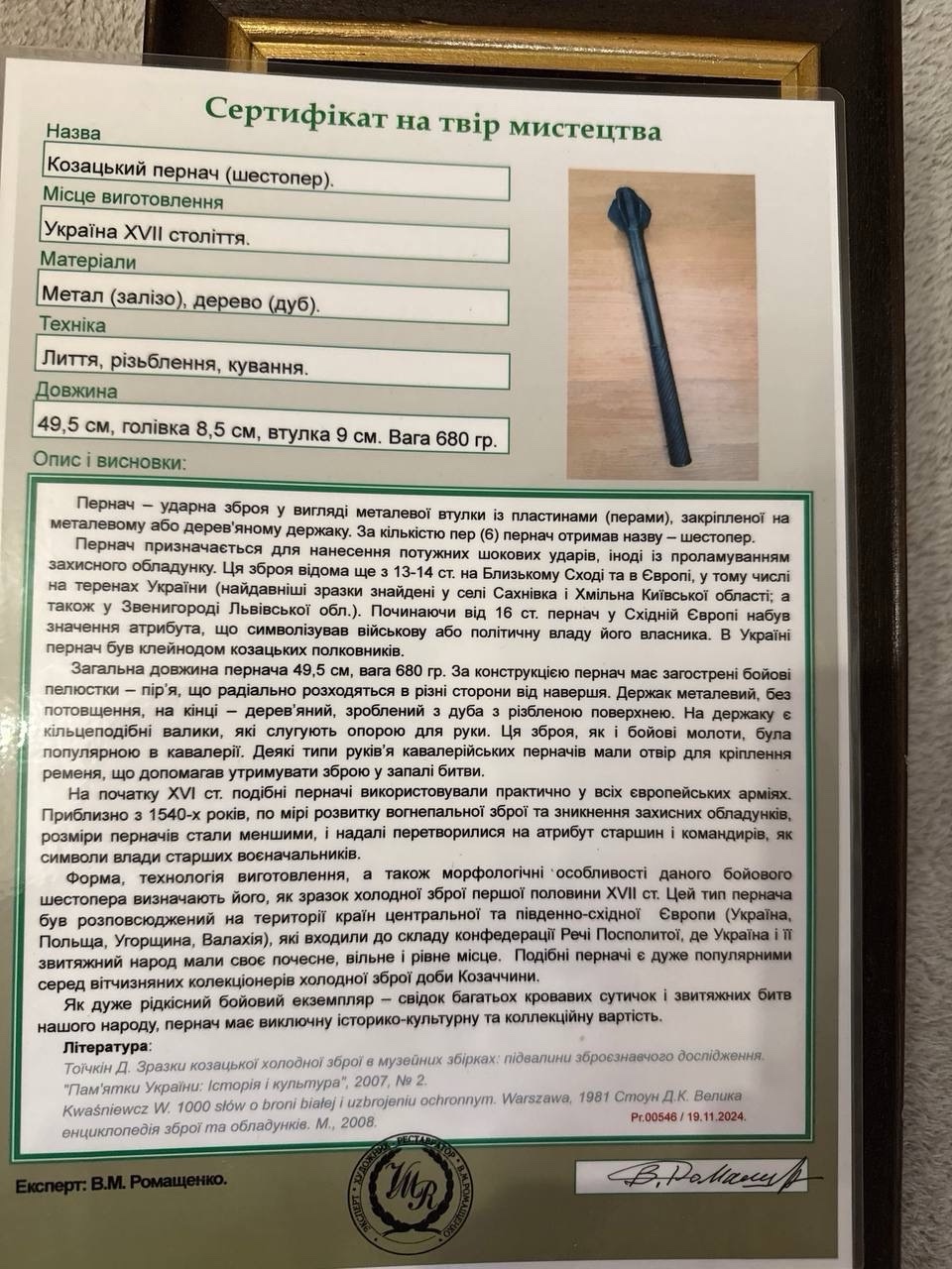 Данный образец является редким свидетельством эпохи Козаччины. Он представляет высокую культурную и научную ценность для частных коллекций и музеев, которые специализируются на истории холодного оружия центральной и юго-восточной Европы.
