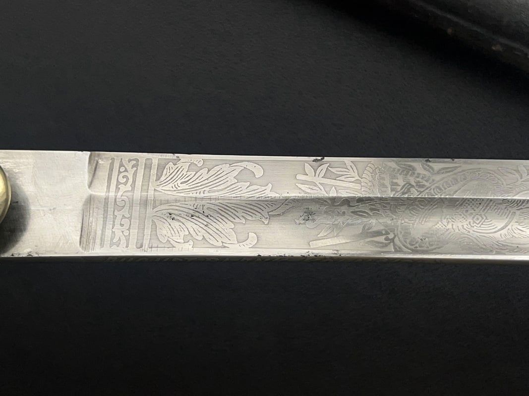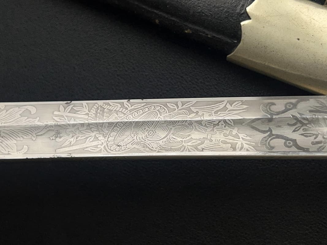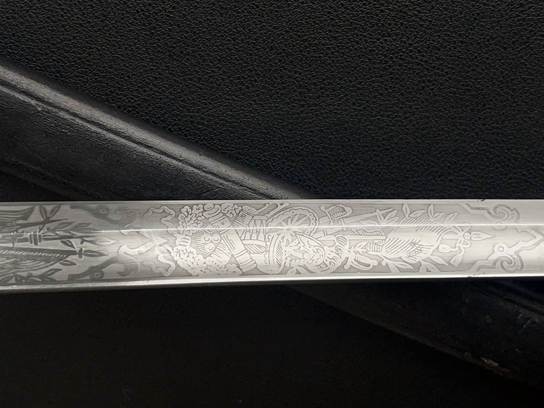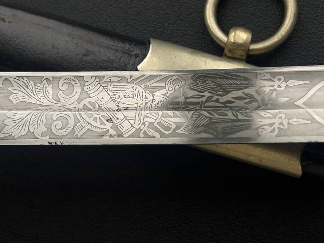 Клинок сабли стальной, никелированный, незначительной кривизны, однолезвийный, с одним долом. Боевой конец двулезвийный. Клинок украшен богатым травлением з ростовым орнаментом, военными трофеями, саблями, пушками, кирасами и знаменем, а также изображением прусского орла.