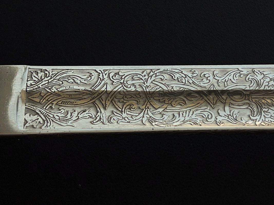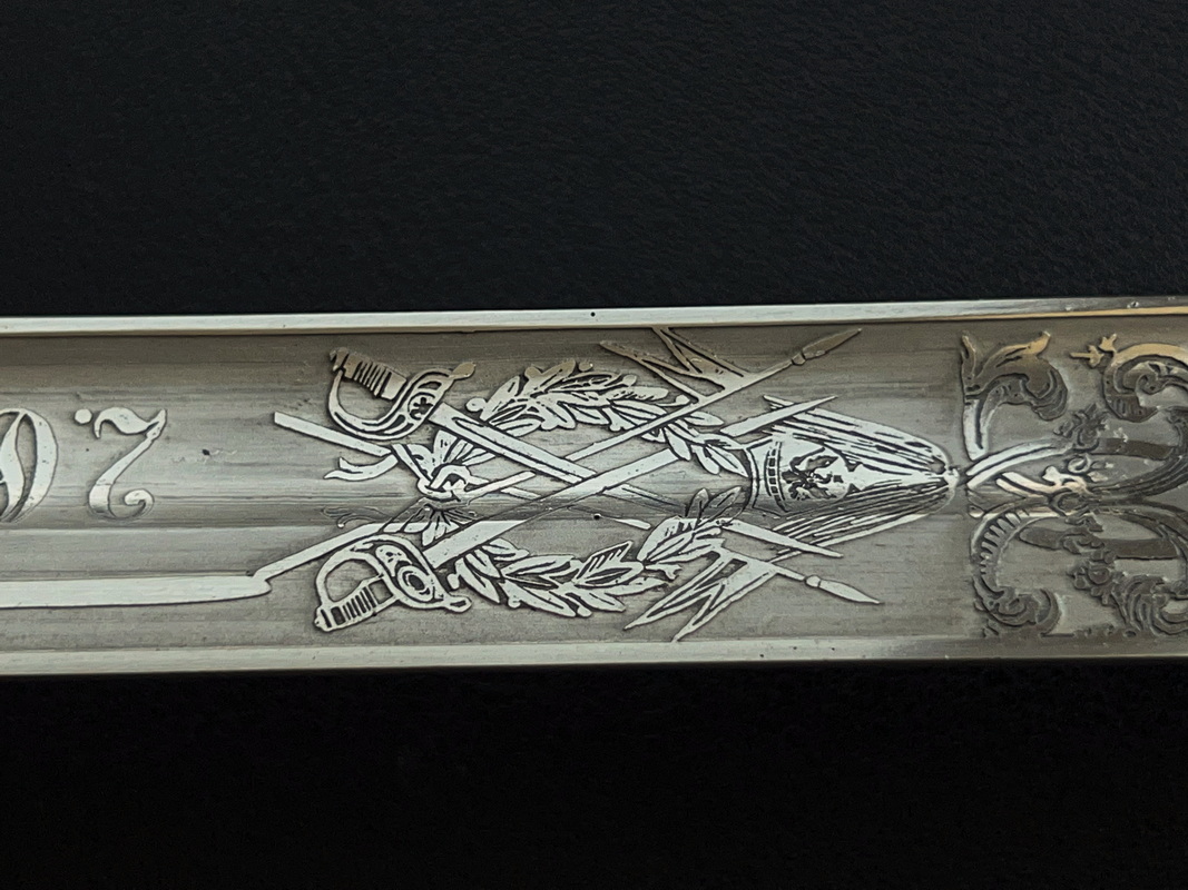 Клинок палаша стальной, прямой, однолезвийный, с одним долом по всей длине и двулезвийным боевым концом. На поверхности клинка нанесено богатое двустороннее травление с изображением кавалерийской арматуры, вензелем императрицы Александры Романовой и надписью: