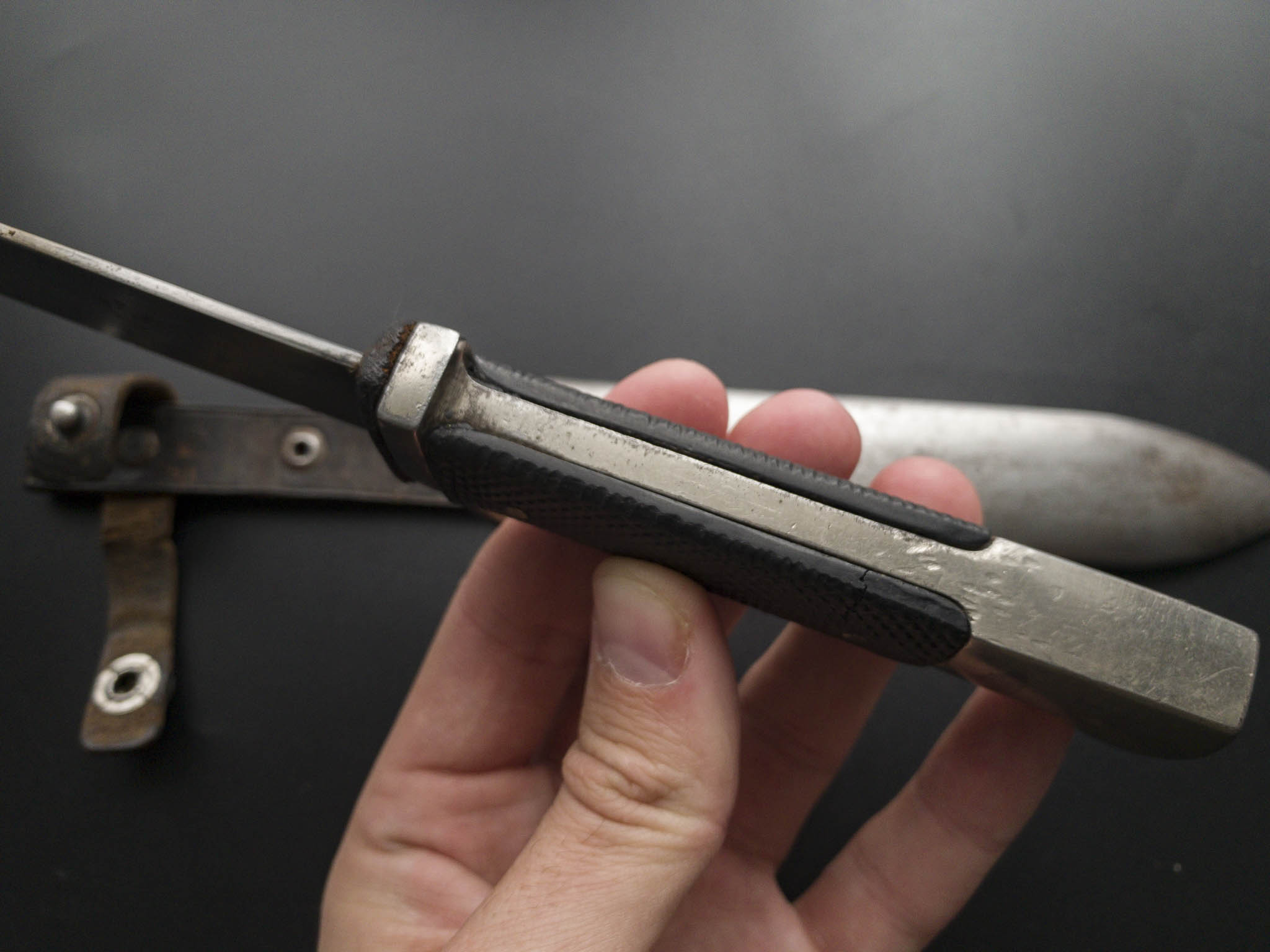 Ранний клинок без рикассо (утолщение на пяте). На реверсе лезвия нанесено название производителя «Anton Wingen Solingen», и рядом патентное клеймо — «Gesch Geschutzt». На клинок надета кожаная прокладка.