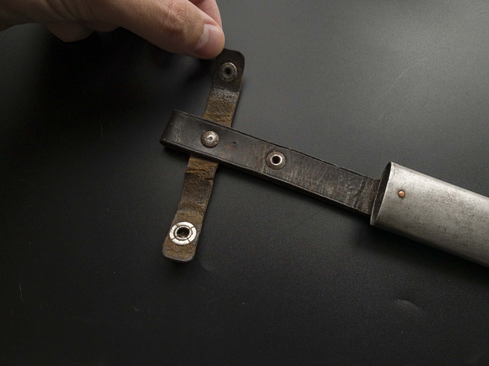 Ножны в неплохом состоянии, без окраса, оригинальный окрас был утерян, поношенное состоянии (смотрите фото ниже, аналогичные ножны на фото). К ножнам приклепан коричневый кожаный подвес, кожа на подвесе по-прежнему эластичная, включая фиксирующую петлю с рабочей кнопкой.