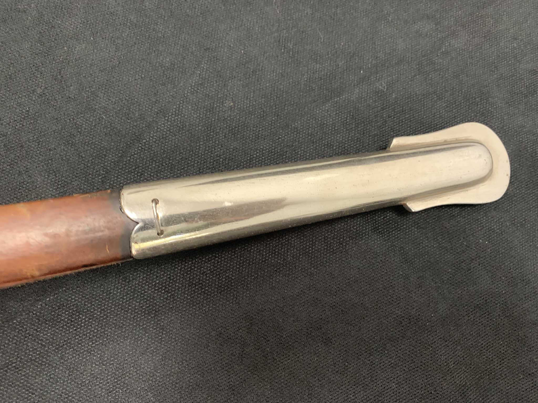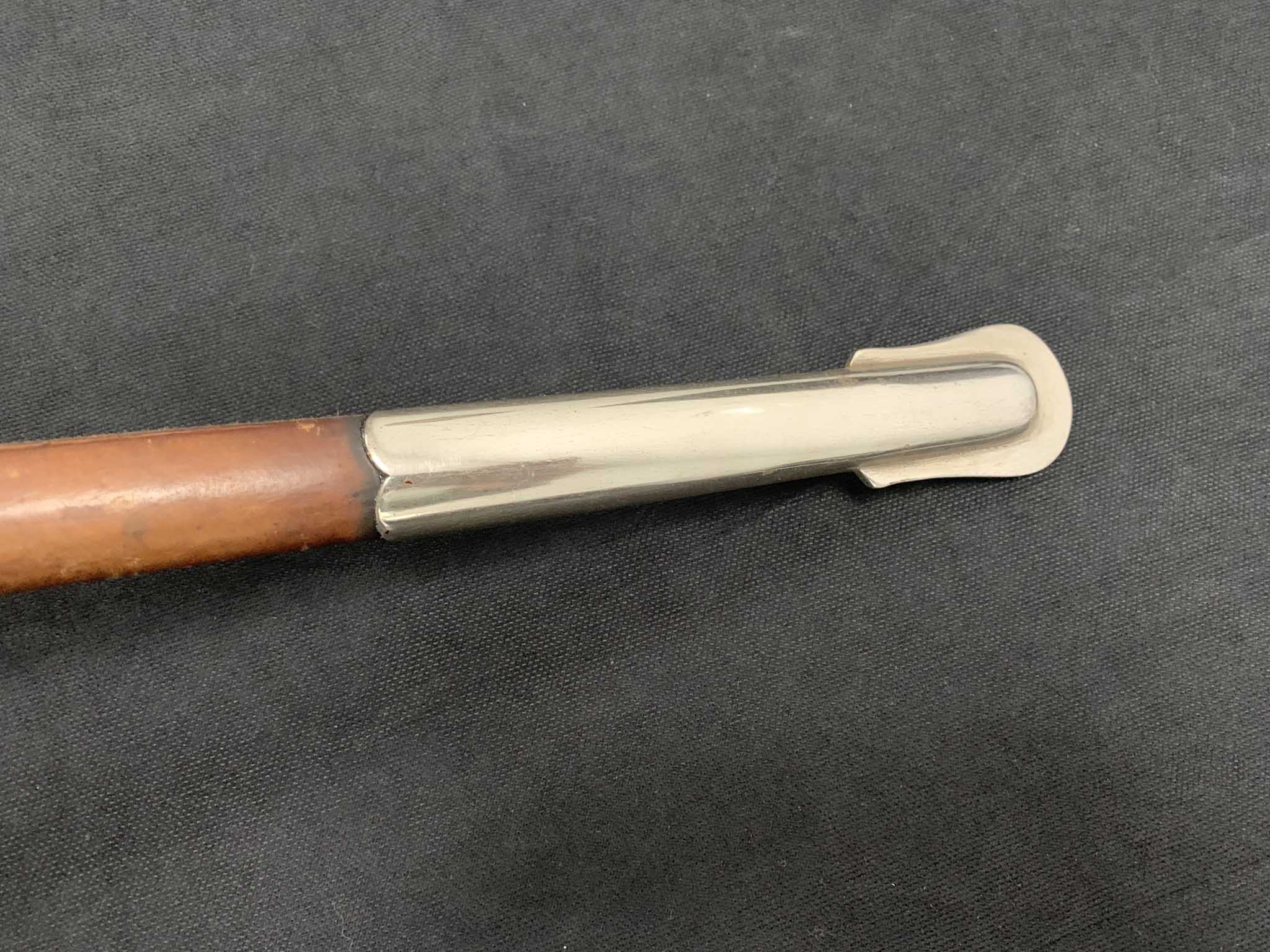 Ножны деревянные обтянуты коричневой кожей. Ножны состоят из никелированного устья и стакана.