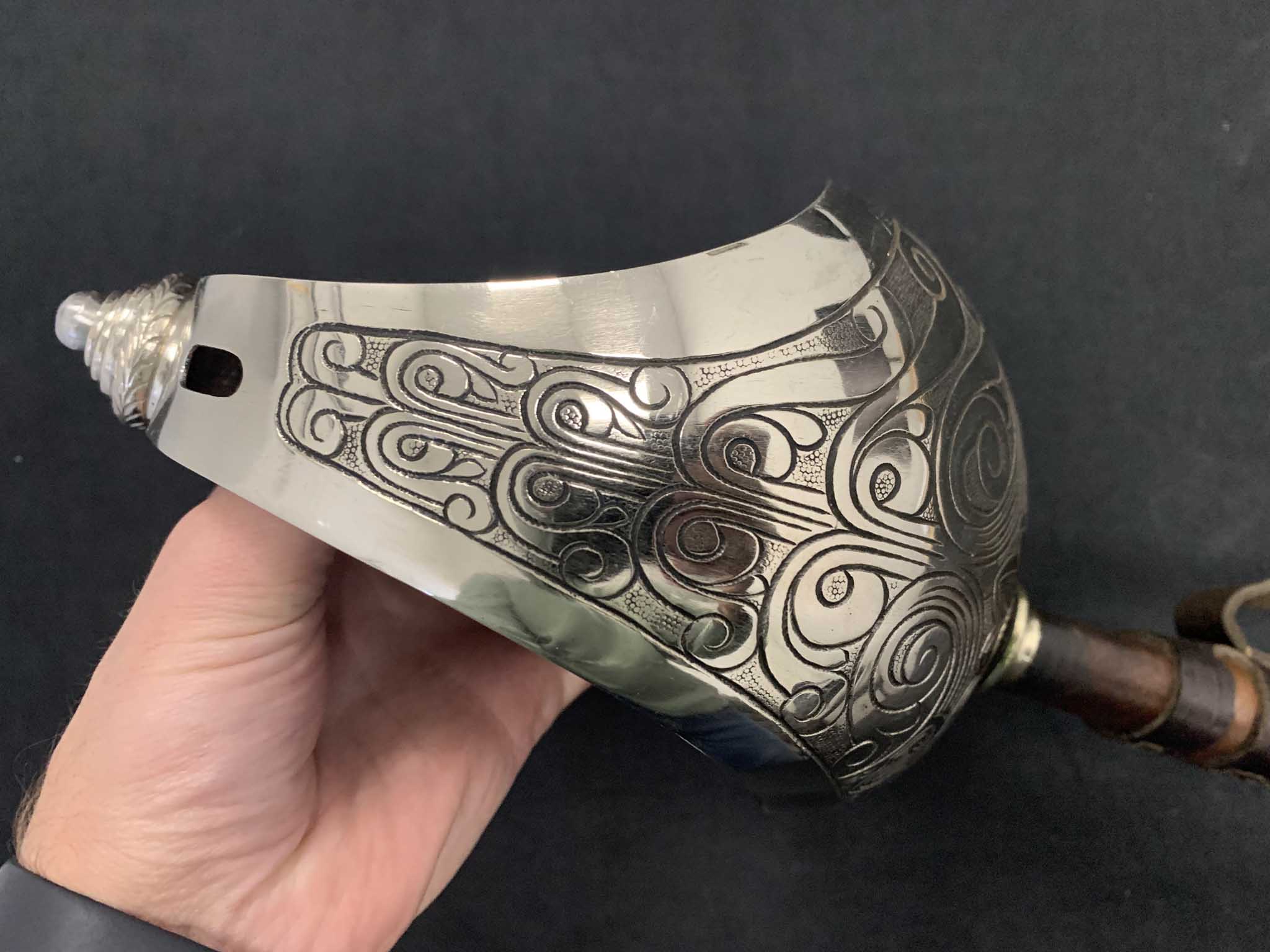 Рукоятка деревянная с поперечными желобками обтянута кожей, вокруг желобков обтянута крученной проволокой.