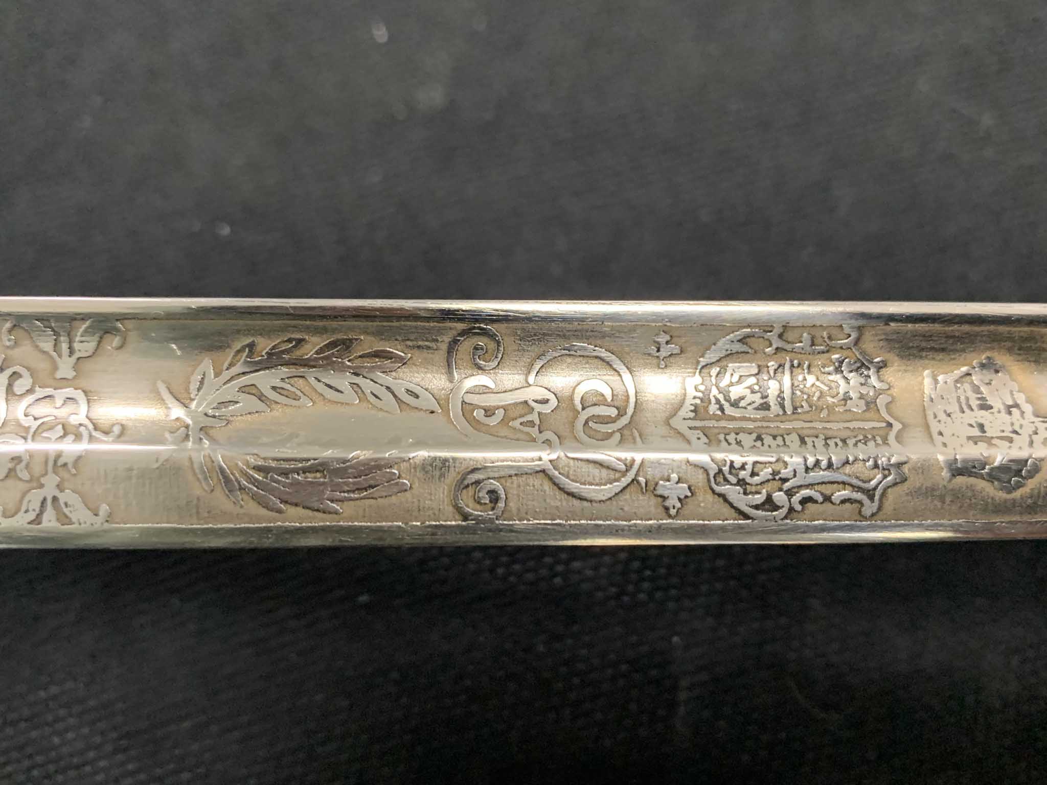 Палаш, практически идентичный модели 1908 года, включал изысканную круглую чашку и гравированный клинок. Узор «жимолость» на круглой чашке похож на узор, вырезанный на эфесе сабли офицера кавалерии 1796 года (рис. 2 и 3).