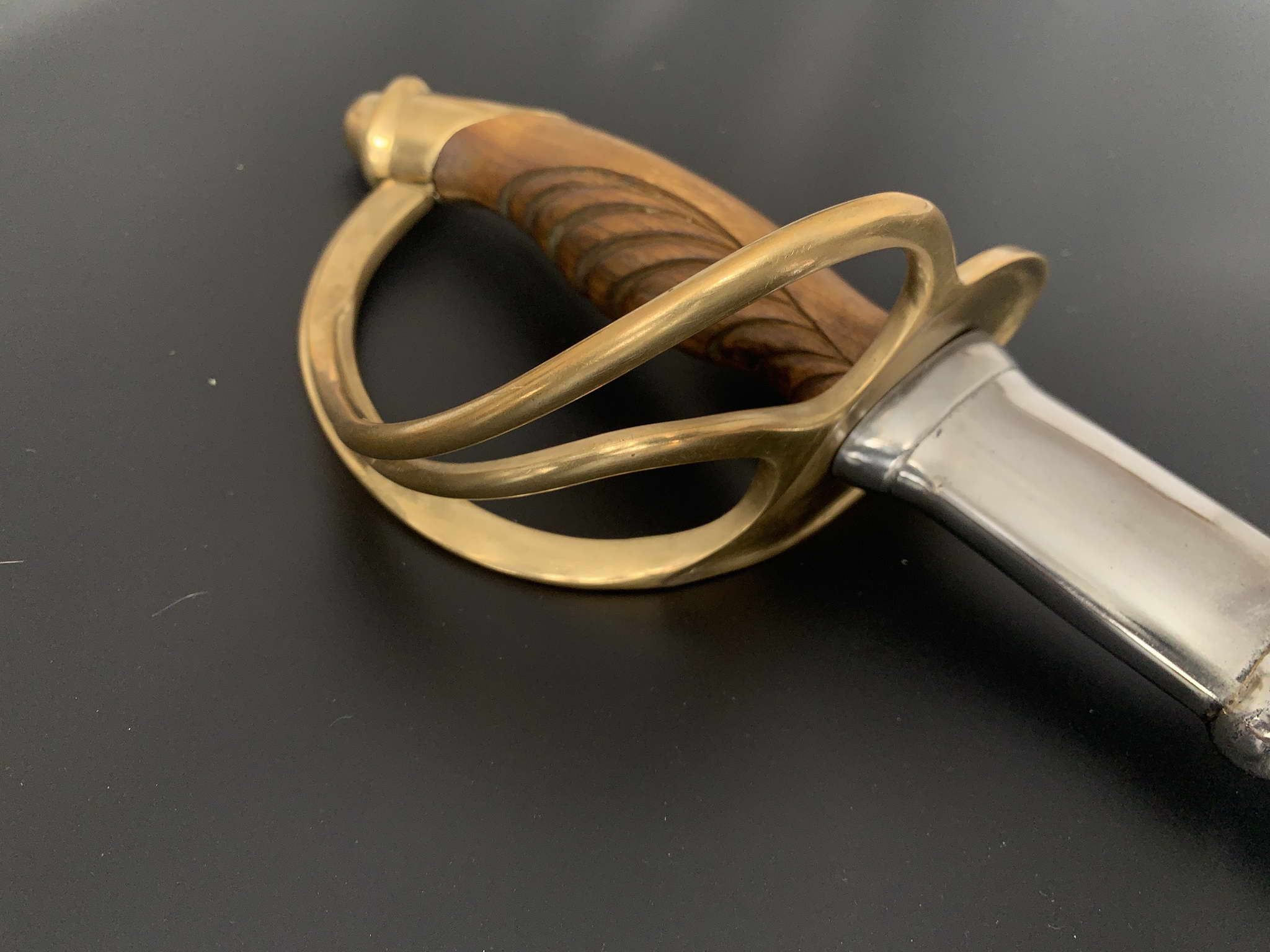 Эфес состоит из рукояти и гарды. Гарда латунная, с тремя дужками включая основную, рукоять деревянная.
