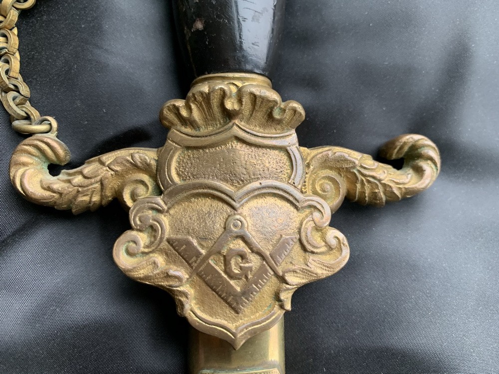 На пяте расположено клеймо «Bent & Bush» — клеймо производителя. Производитель действовал в период с 1849 по 1933 года. Эфес состоит из черной деревянной рукояти и латунной гарды. Веретенообразная рукоять с металлической головкой в виде рыцарского шлема с опущенным забралом и плоской декоративной крестовиной с рельефной орнаментацией и концами; головка соединена с одним из концов цепочкой. На лицевой стороне рукояти красный крест, в обрамлении рельефного креста. Лицевая сторона крестовины в центре расположен щитик, на нем символ масонства «Циркуль и наугольник с буквой G» Ножны металлические. Прибор ножен литой, латунный, состоит из узкого устья, одной обоймици с кольцами для подвеса фигурного наконечника. Все детали прибора закреплены одиночными винтами на обратной стороне футляра ножен. Поверхность деталей прибора покрыта простым литым орнаментом. На обоймице с лицевой стороны изображен латинский крест. Золотое обрамление всех деталей шпаги и ножен свидетельствует, что владелец был выдающимся командиром