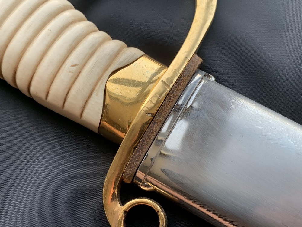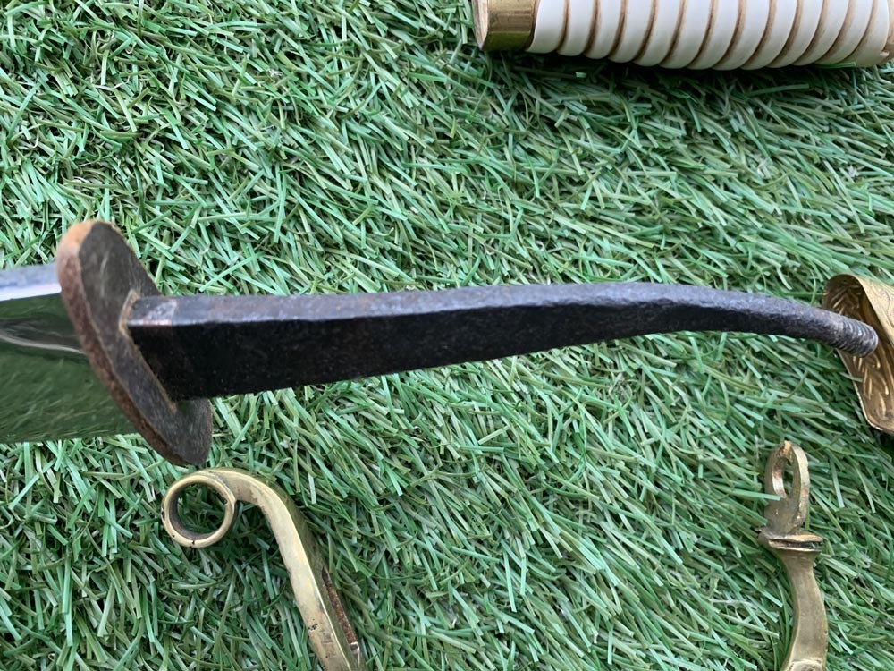 История предмета: Данный предмет стал находкой ! Нашли его в грунте со следами коррозии. Клинок тщательно очистили от мелких повреждений. Метал клинка сильно не поврежден, но видны раковины на клинке и на приборе рукоятки. В дальнейшем предмет был выкуплен мной и передан профессиональным реставраторам. Реставраторы нанесли современное травление по типу того, что должно было находиться на сабле, клинок повторно никелировали, прибор рукояти позолотили (чистым золотом) и профессионально вырезали рукоять из кусочка слоновой кости. Ножны были воссозданы в ручную и никелированы кузнецами реконструкторами. По окончанию всех реставрационных работ клинок и ножны под матировали под старовину.