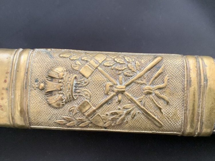 Ножны никелирование с латунным стаканом, устьем и кольцом под зацеп по средине. На устье ножен расположена эмблема горнодобывающей промышленности, на стакане растительный узор.