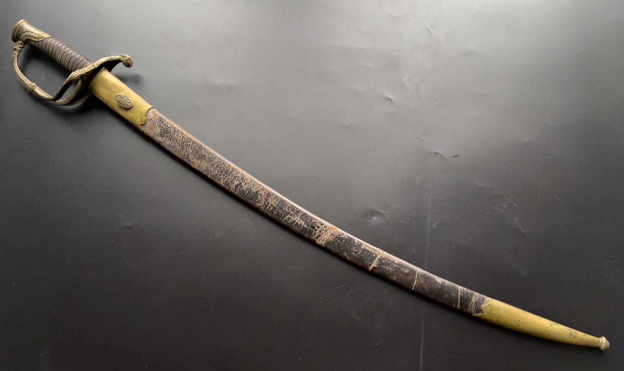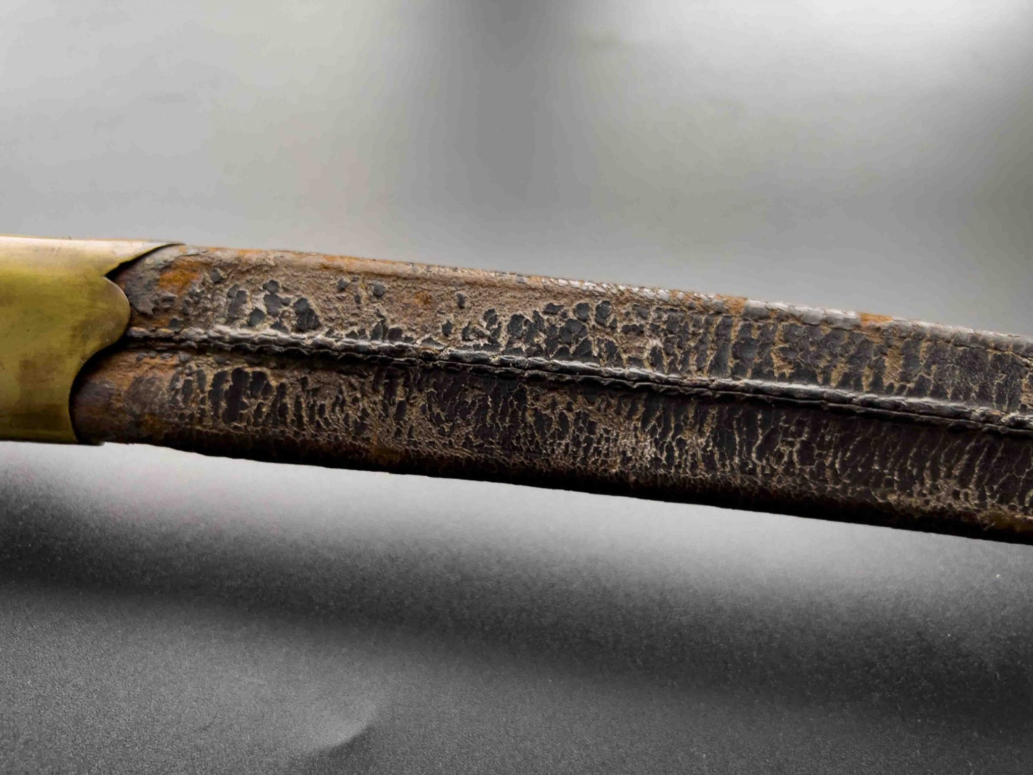 Ножны коричневого цвета имеют латунный прибор, состоявший из устья со шпеньком и наконечника. Кожа на ножнах старая и теряет форму при вынимании клинка).