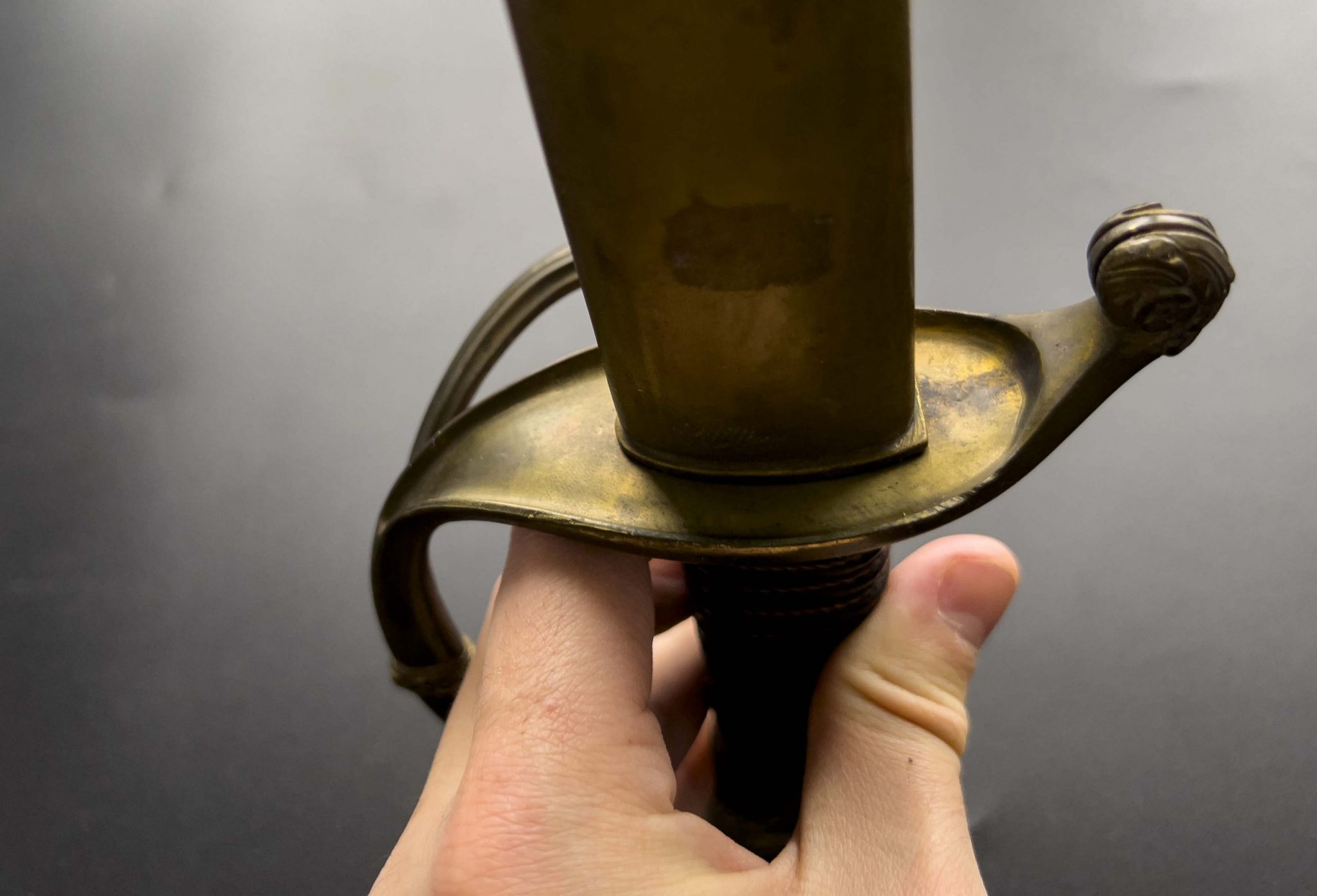 Эфес сабли состоит из рукояти и гарды, его металлические части выполнены из латуни украшены позолотой.