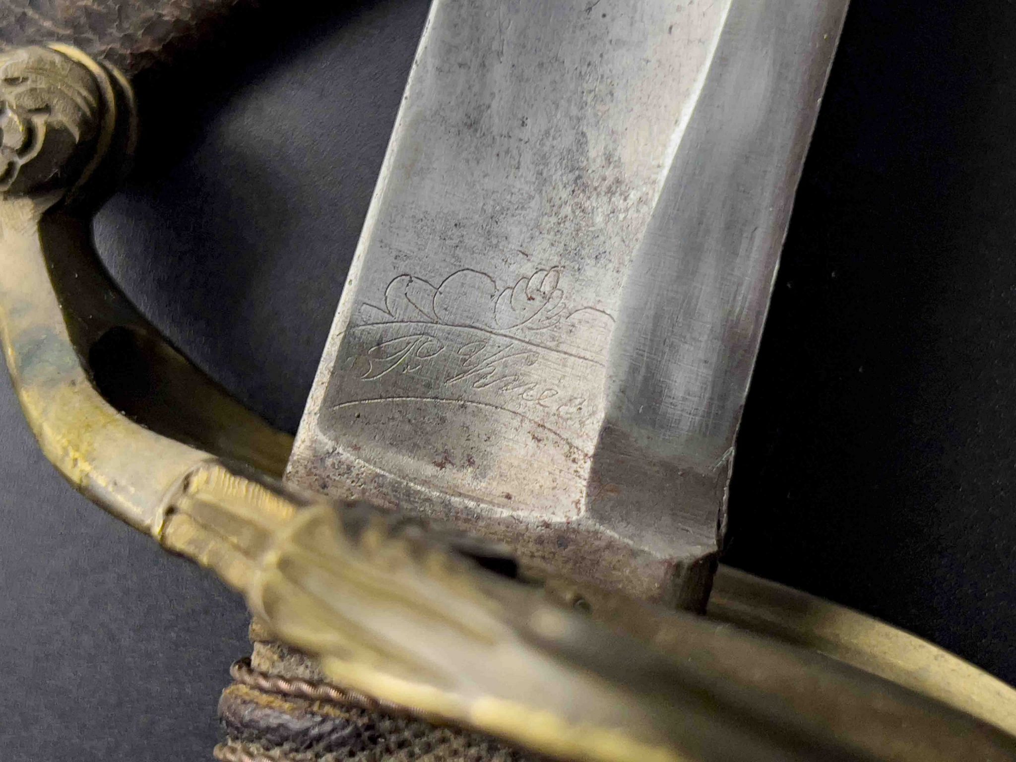 Верхняя часть клинка на две третьих длины с обеих сторон покрыта остатками синения и украшена травленными изображениями венка и военной арматуры с обратной стороны.