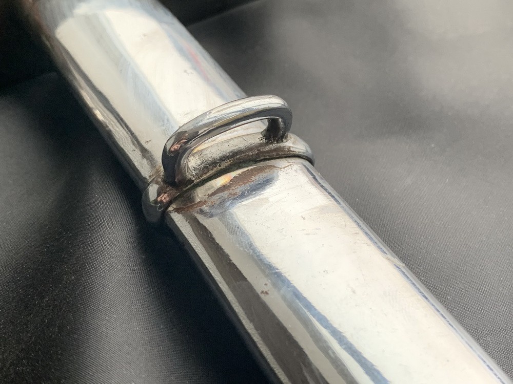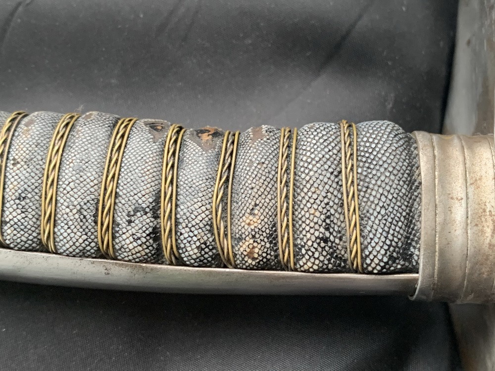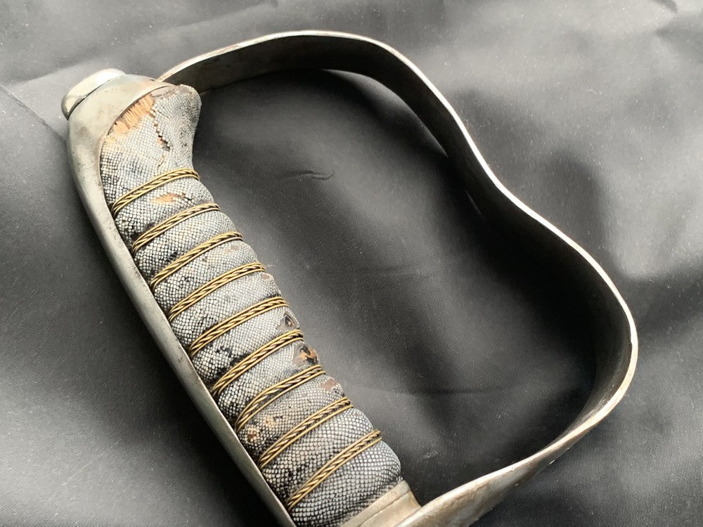 Спинка рукояти прикрыта вогнутой металлической планкой, плавно переходящей в округлую головку, зафиксированную овальной гайкой на хвостовике клинка. Внизу у крестовины рукоять перехвачена профилированной втулкой овального сечения.