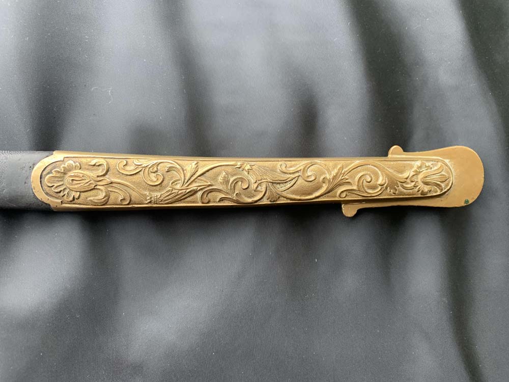 Ножны сабли деревянные, обтянутые чёрной акульей кожей. Латунный с позолотой прибор включает устье, обоймицу (обе детали с ушками и портупейными кольцами), наконечник с башмаком.