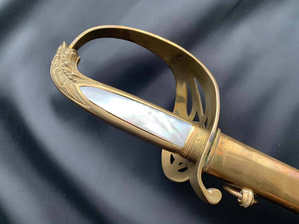 Эфес сабли состоит из рукояти и гарды. Рукоять латунная с позолотой, прямая, уплощённая, с боковыми вставками из перламутра. Верхняя часть с головкой, украшенная рельефным растительным орнаментом, отогнута в сторону лезвия. Головка соединена заклёпкой с хвостовиком клинка. У крестовины рукоять прикрыта цилиндрической втулкой. Латунная с позолотой гарда образована основной и дополнительными дужками, формирующими прорезную защитную чашку с овальным прорезным картушем на правой стороне, в который вписан обвитый корабельным канатом якорь. Каплевидный конец средней дужки (она же крестовина), отогнут вниз.