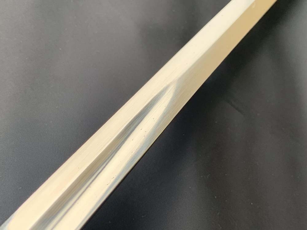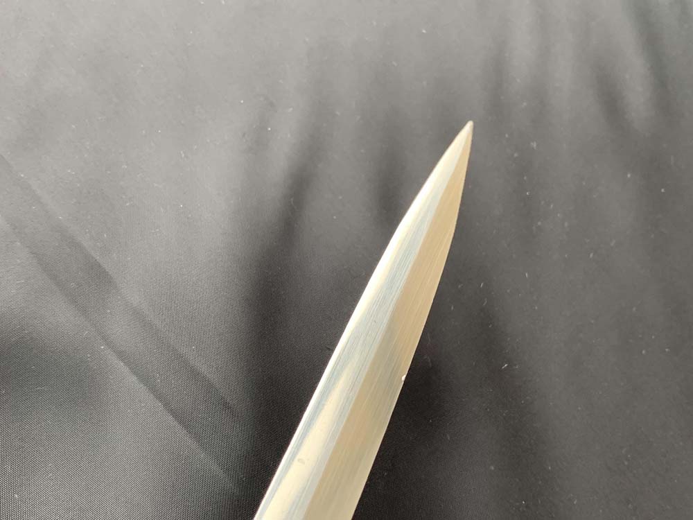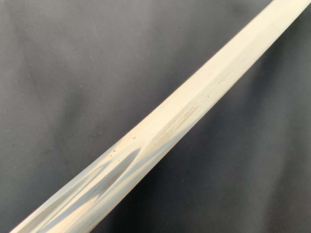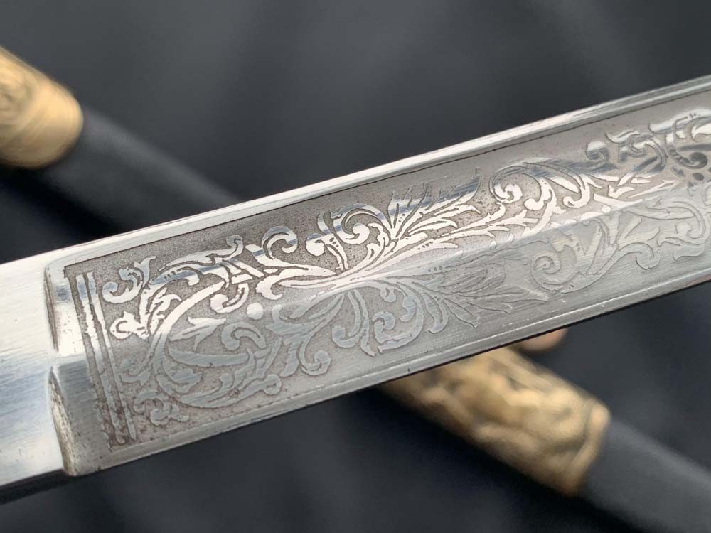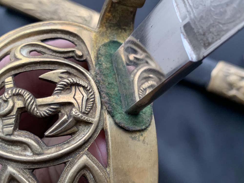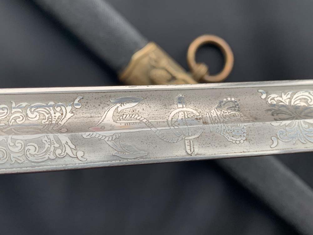 Клинок сабли стальной никелированный, слегка изогнутый, однолезвийный (боевой конец двулезвийный), однодольный. На обухе клинка и на две третьих всего клинка красивое травление на морскую и растительную тематику. На пяте на правой стороны клинка вытравлено прямоугольное товарное клеймо Magasin du Nord («Северный магазин»).