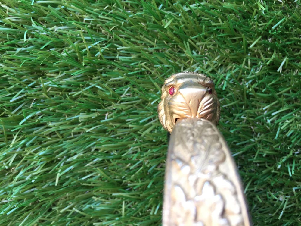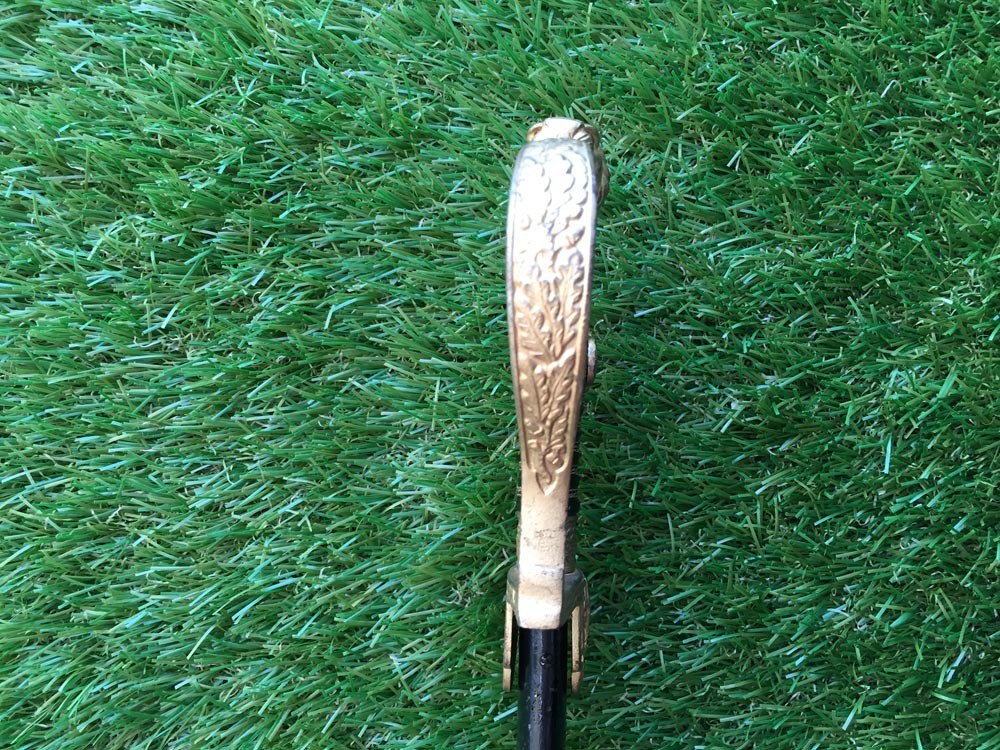 Рукоять бакелитовая, с горизонтальными желобками, перевитыми металлической проволокой. Спинка рукояти сплошная, с растительным орнаментом по центру, плавно переходящая в головку, выполненную в виде головы льва. В глазах льва вставлено два красных камня. В центре спинки рукояти имеется декоративное расширение.