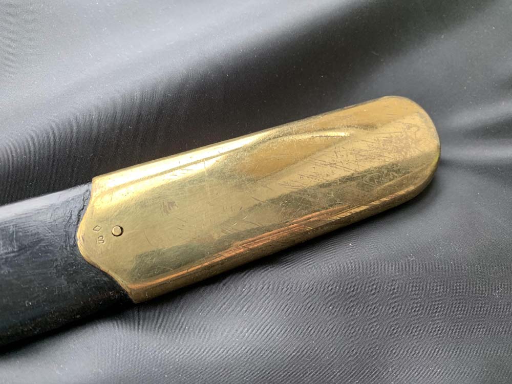 Клинок стальной, никелированный, незначительной кривизны, однолезвийный, с одним широким и тремя узкими долами.