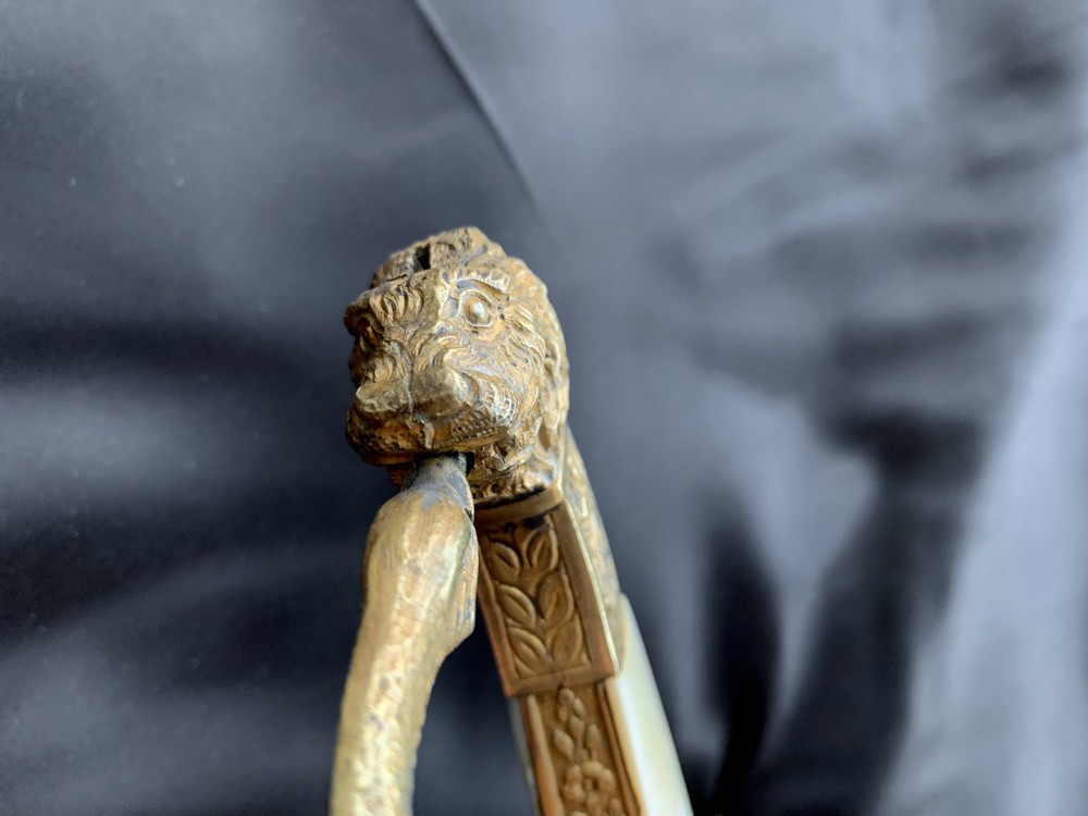 Эфес шпаг состоит из рукояти с латунной загнутой львиной головкой и латунной гарды.