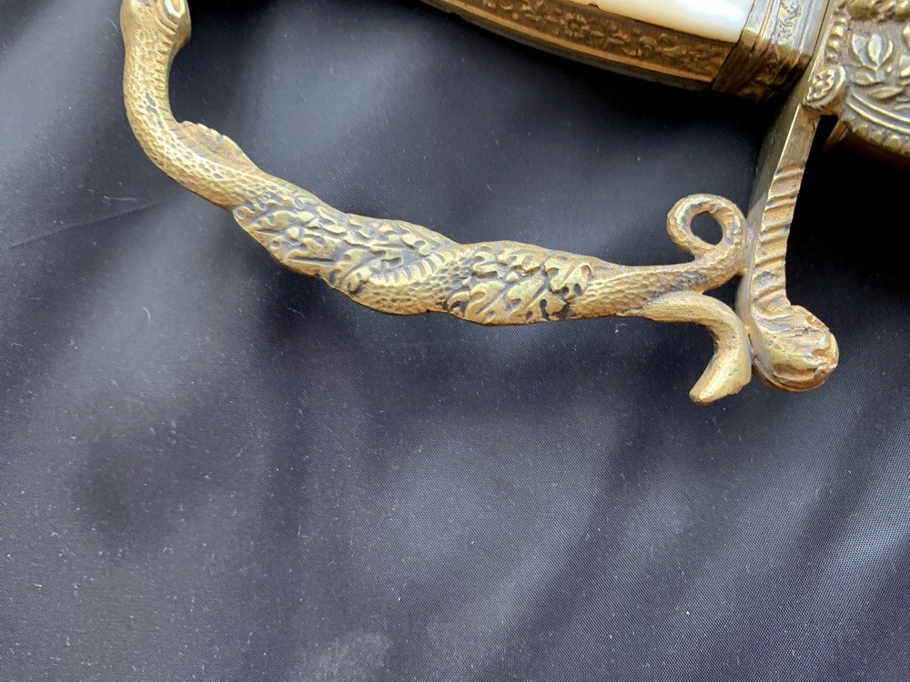 Рукоять образована двумя перламутровыми щечками, скрепленными двумя латунными ленточками, орнаментированными рельефными бусинами. Внизу на рукояти имеется прямоугольная латунная втулка украшена растительным орнаментом.