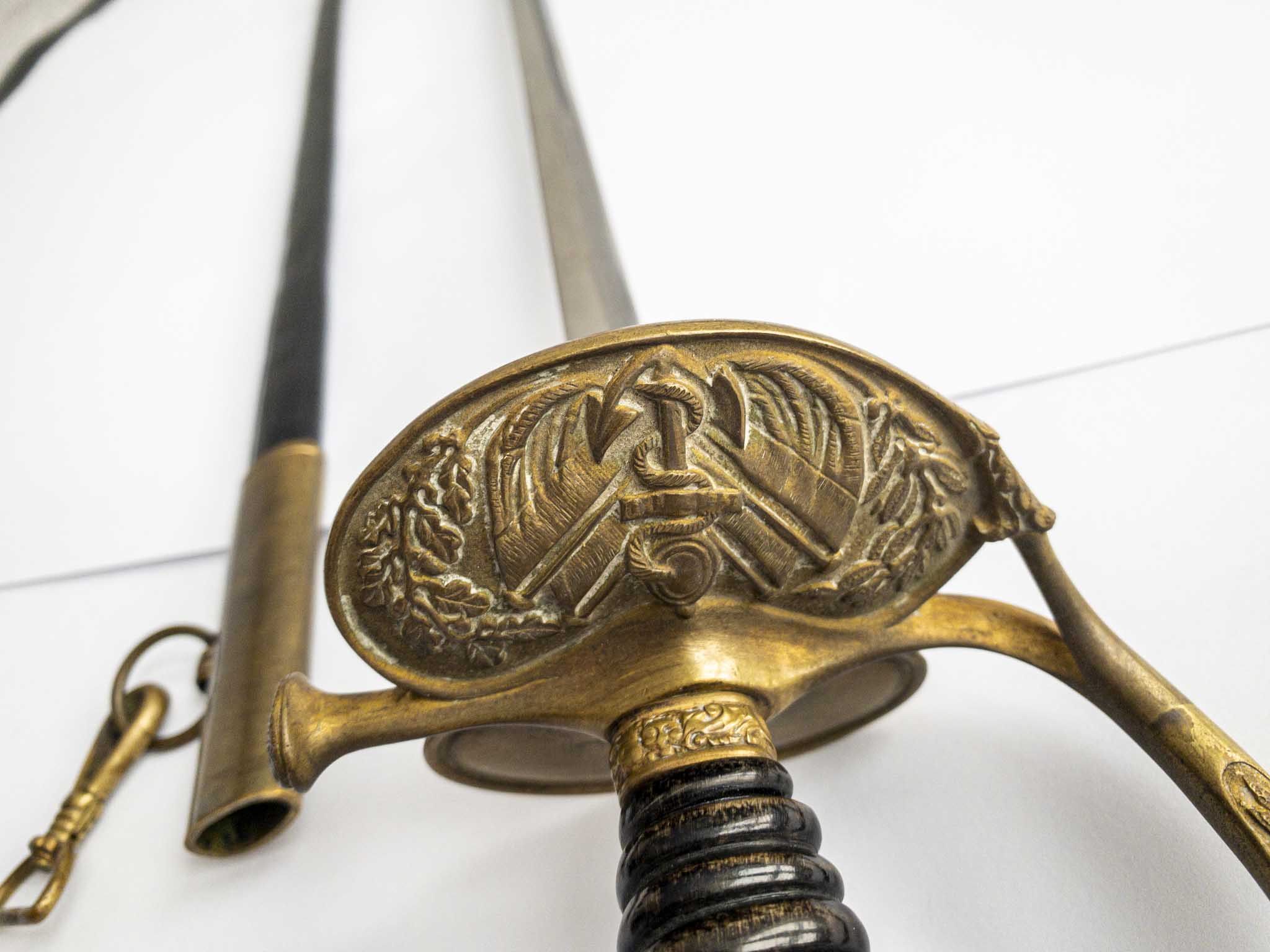 Ножны шпаги кожаные тиснёные с бронзовым прибором. Прибор включает устье и портупейное кольцо на ушке с частью детали подвеса, а также наконечник с асимметричным башмаком.