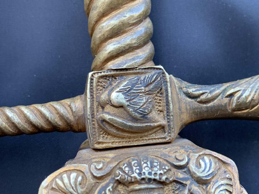 Эфес состоит из шести частей: защитной дужки с перекрестием, рукояти, щитка, навершия, фиксирующей втулки, фиксирующего навершия. Детали выполнены в техники литья, выколотки, имеют слой позолоты, рукоять латунная, на щитке эмблема железнодорожной тематики с императорской — королевской короной. Общая сборка детали в одно единое целое осуществляется методом натяга всех частей эфеса, с последующей фиксацией к резьбе хвостовика клинка. Эфес такой формы предназначалось для защиты руки от прямых и боковых ударов, но в данном случае, скорее всего, несет символическое значение. Со стороны клинка к крестовине примыкает овальный кожаный ограничитель коричневого цвета. Элемент служит ограничителем между эфесом и ножнами шпаги. При вкладывании клинка в ножны мягкая по своим свойствам деталь гасит ударное воздействие обеих металлических частей, тем самым предотвращая износ материала и не нужный звон.