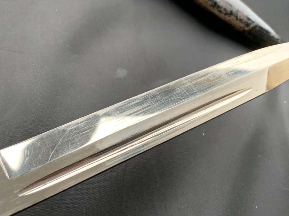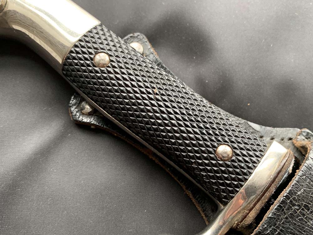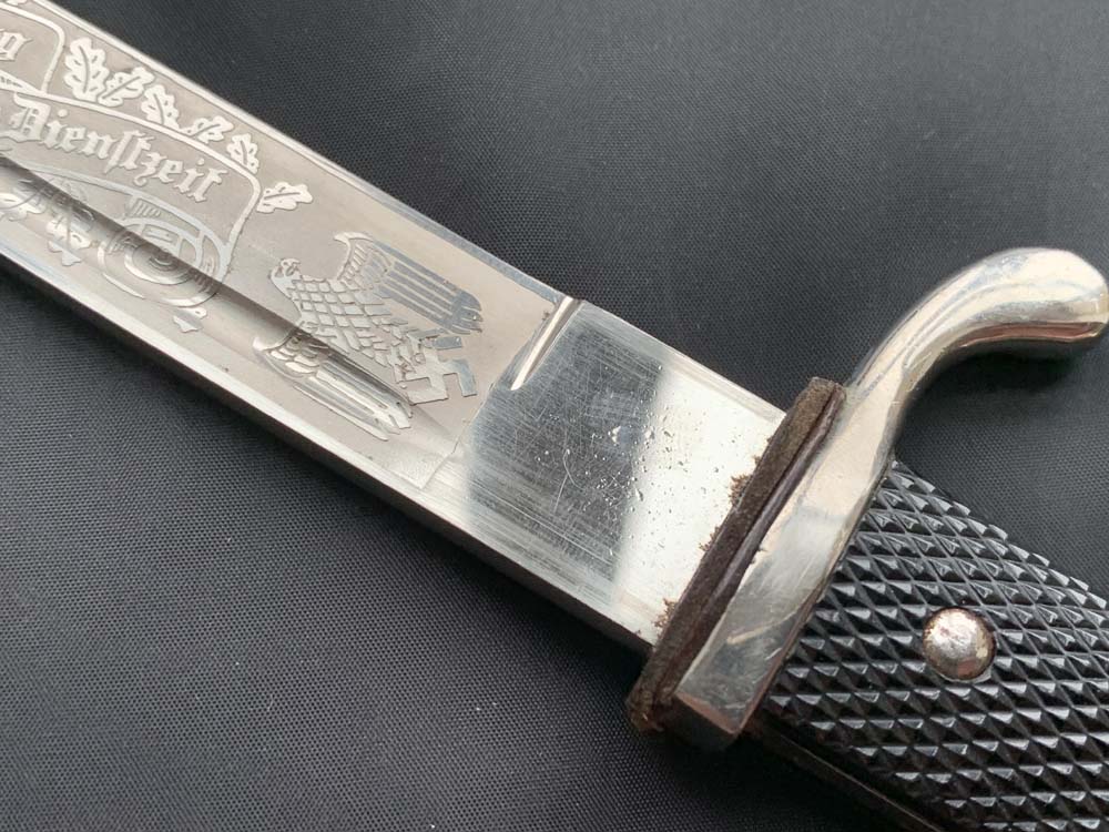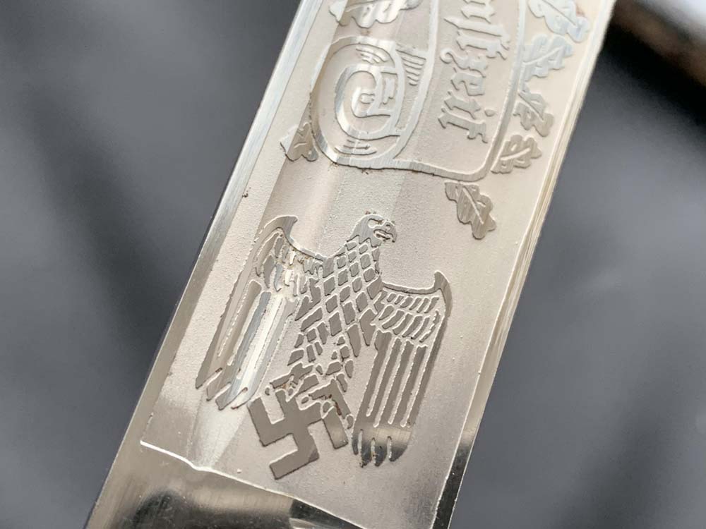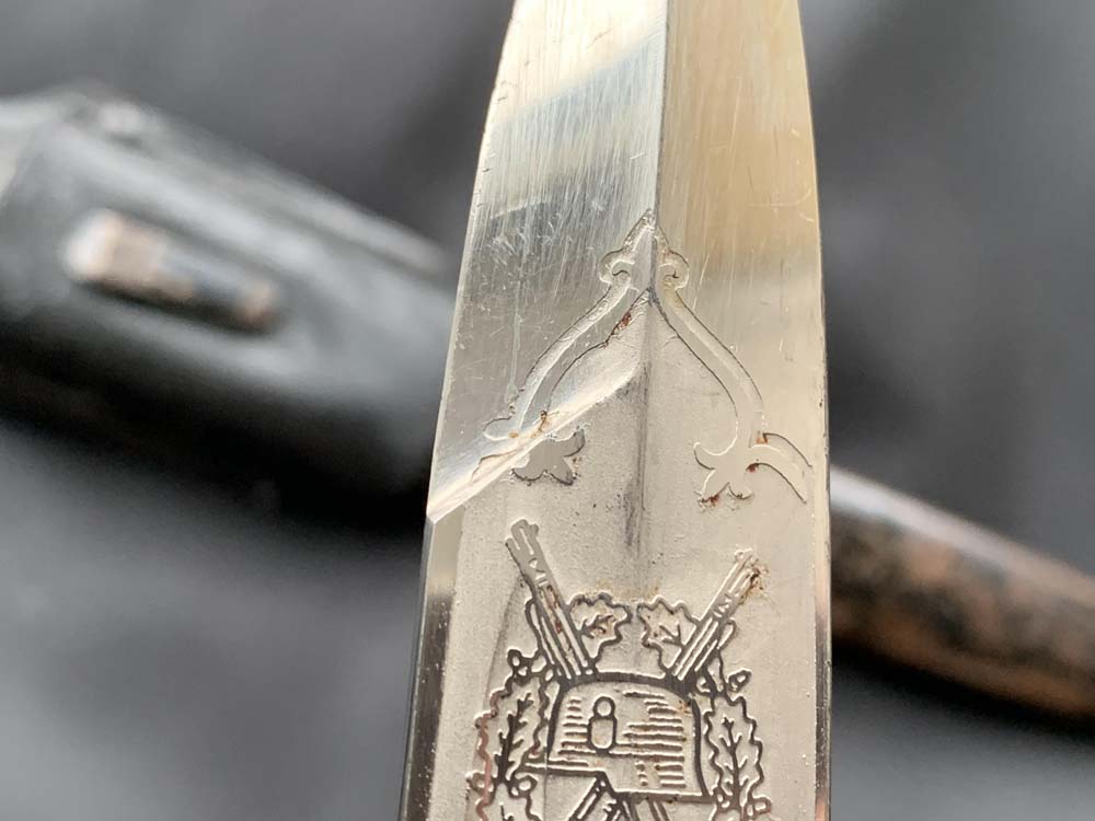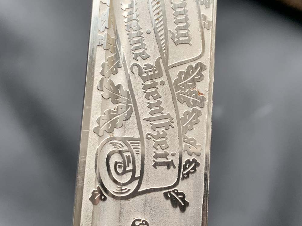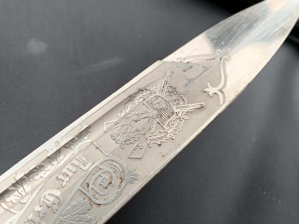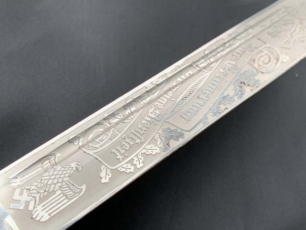 Клинок прямой, стальной, однолезвийный, никелированный, с одним долом на каждой стороне. Боевой конец двулезвийный, «акулий зуб». Клинок с внешней стороны богато украшен травлеными картушами с изображением дубовых листьев, военной арматуры, герба наземных сил Вермахта, надписи — «Zur Erinnerung an meine Dienstzeit» (В память о моей службе!). На пяте клинка маркировка известной немецкой фирмы производителя «Carl Eickhorn. Solingen». Тип травления по каталогу Carl Eickhorn: №3220