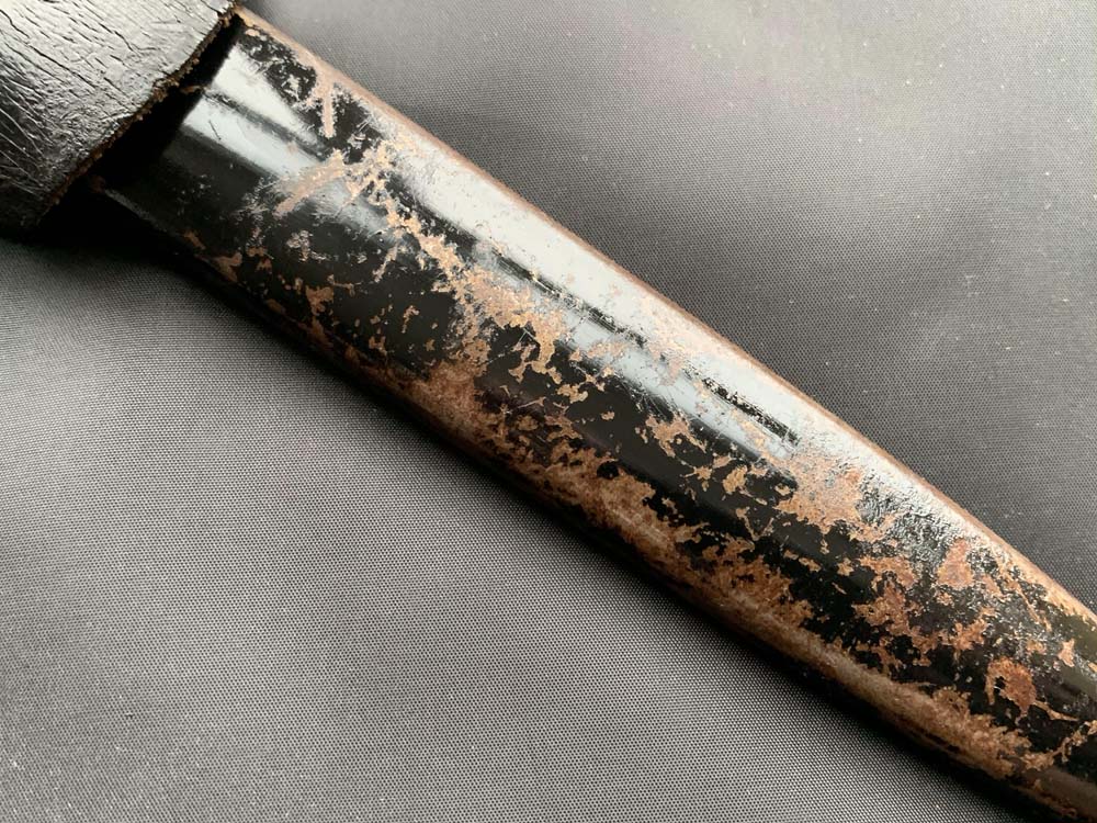Ножны стальные со вставным подпружиненным устьем, которое крепится при помощи одной винта, шпеньком и шариком на конце. Ножны окрашены в чёрный цвет (в родной краске, с частичной утратой) с черным кожаным подвесом.