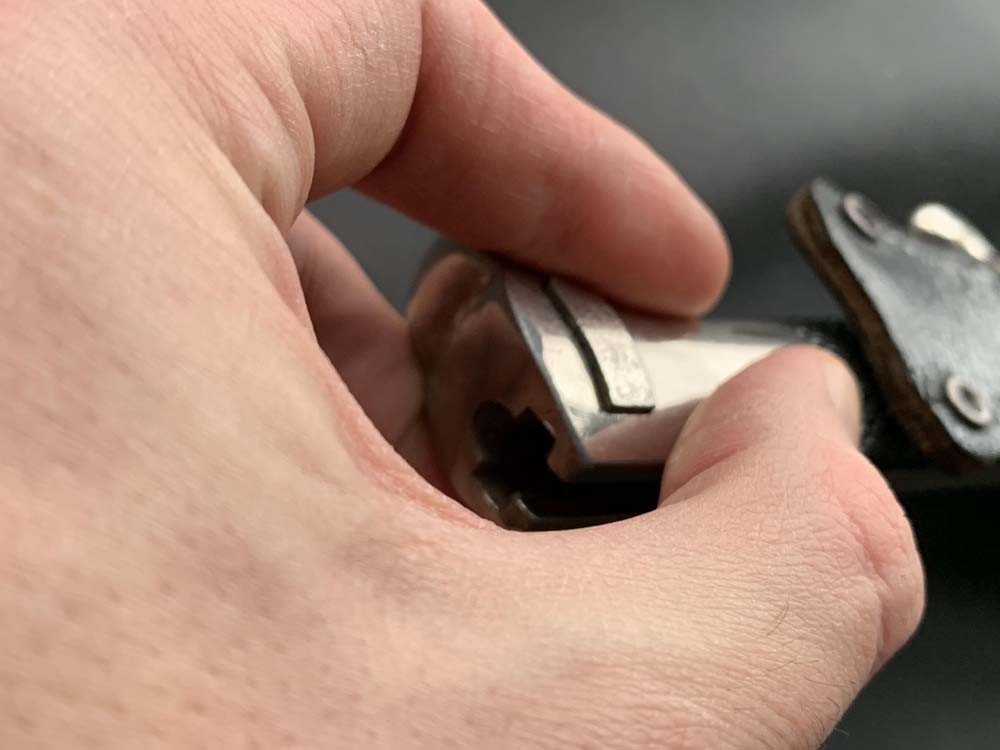 Рукоять образована двумя пластиковыми рифлёными щечками, скрепленными с хвостовиком двумя винтами. В головке рукояти, выполненной в виде стилизованной птичьей головы, — Н- образный паз и пружинная защелка с внутренним расположением спиральной пружины. Крестовина рукояти стальная, никелированная, с загнутым вверх концом. Кольцо для ствола винтовки в этой модели штыка не предусматривалось.