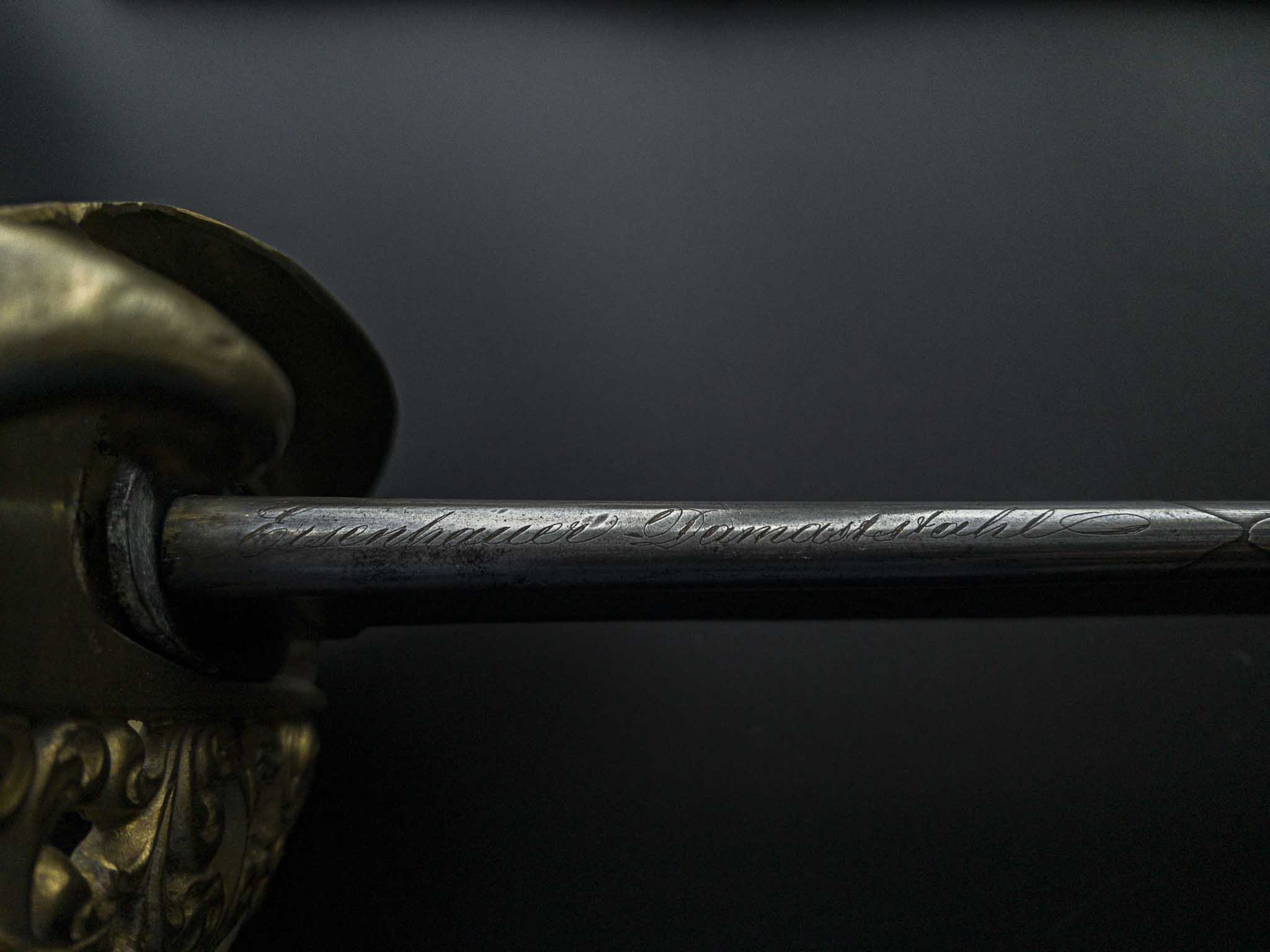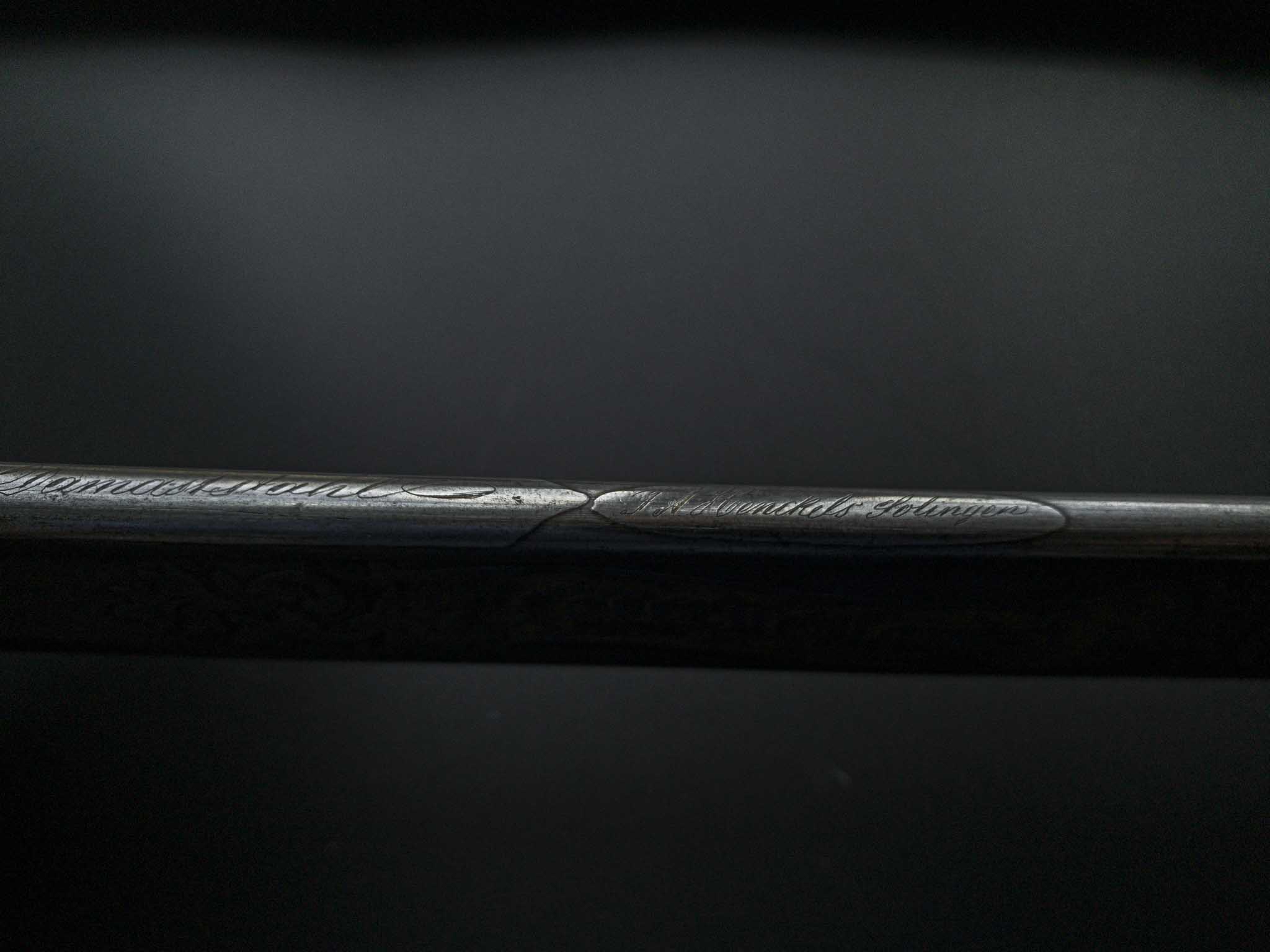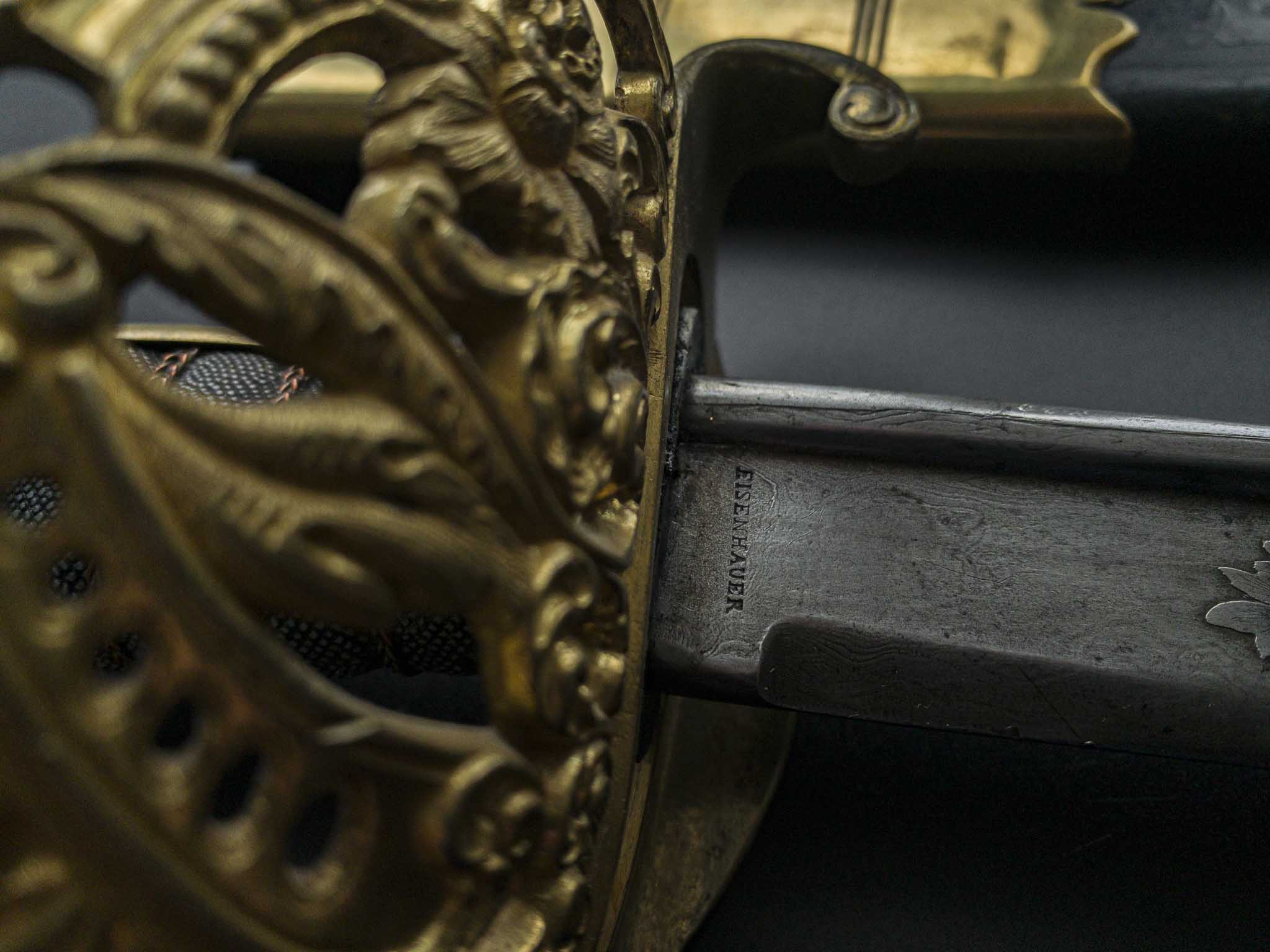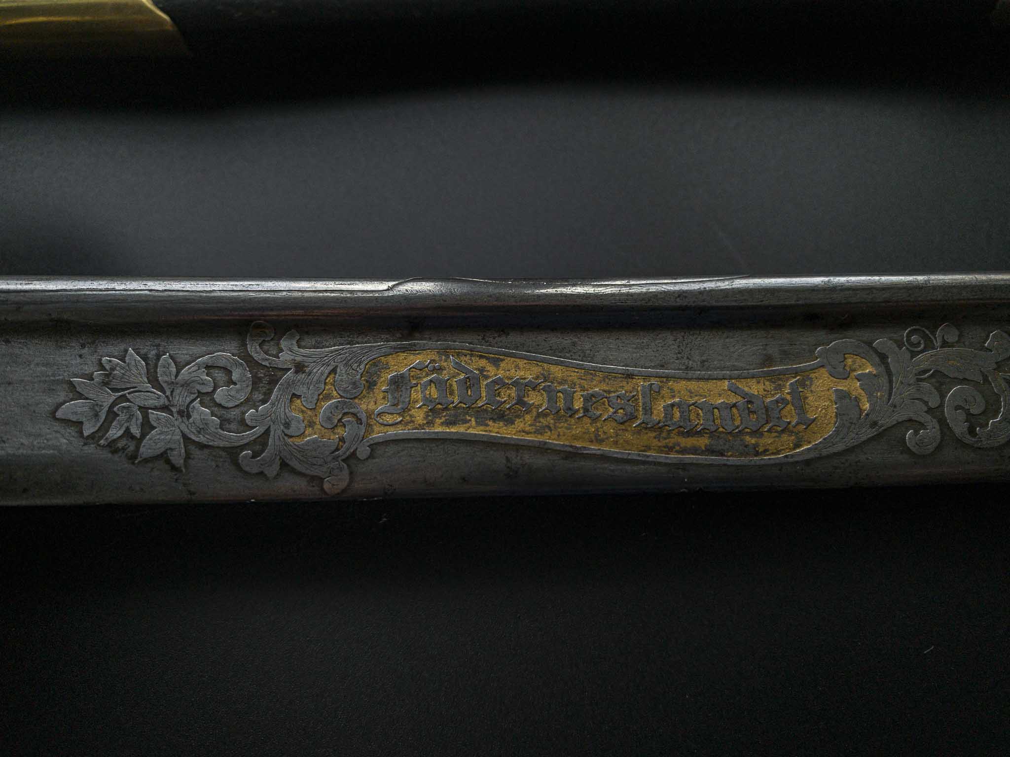 Клинок выполнен из дамаска, однолезвийный с утолщенным обухом, переходящей с пяты на элмань. Клинок украшен травлением с маленьким гербом Швеции и сияющей звездой и надписью в растительном обрамлении «Fäderneslandet», и «Konugen» с украшением позолоты. На пяте нанесены клейма штампом, на левой стороне клинка «Eisenhauer» на правой клеймо производителя «Zwilling j.a. Henckels». На обухе нанесено клеймо в обрамлении Eisenhauer, Damaststahl, J.A. Henckels.