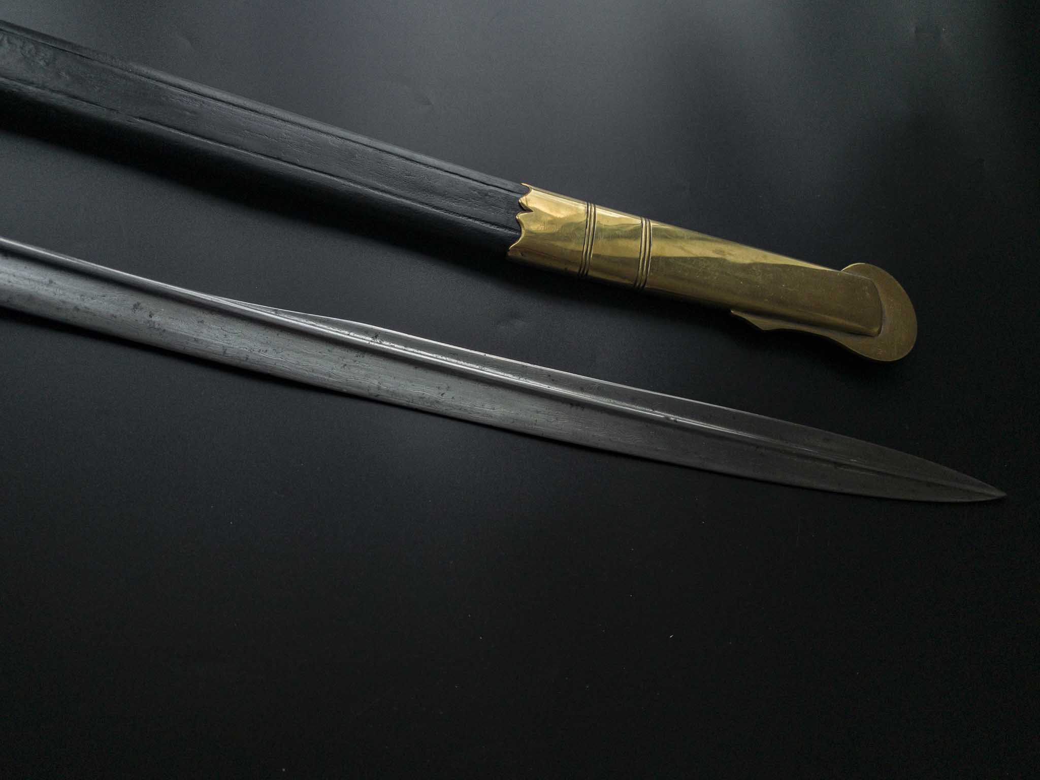Ножны деревянные обтянуты черной кожей, с латунным позолоченным прибором, состоящим из устья, обоймицы и стакана, на устье и обоймице имеются подвижные кольца для портупеи.