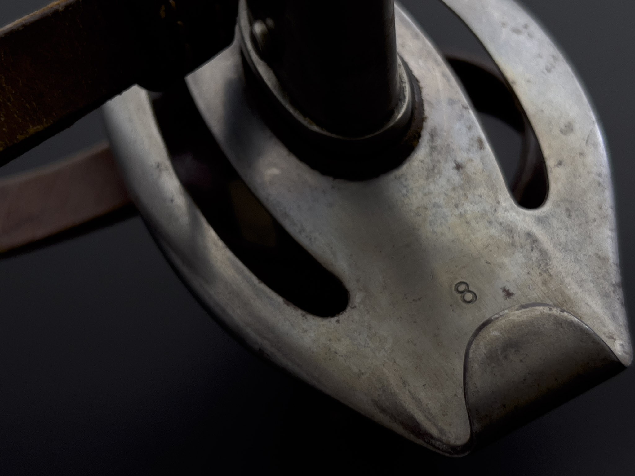 Гарда сабли образована широкой защитной дужкой с полукруглым изгибом, отходящей от головки и образующей у крестовины симметричную чашку с двумя прорезями по сторонам.