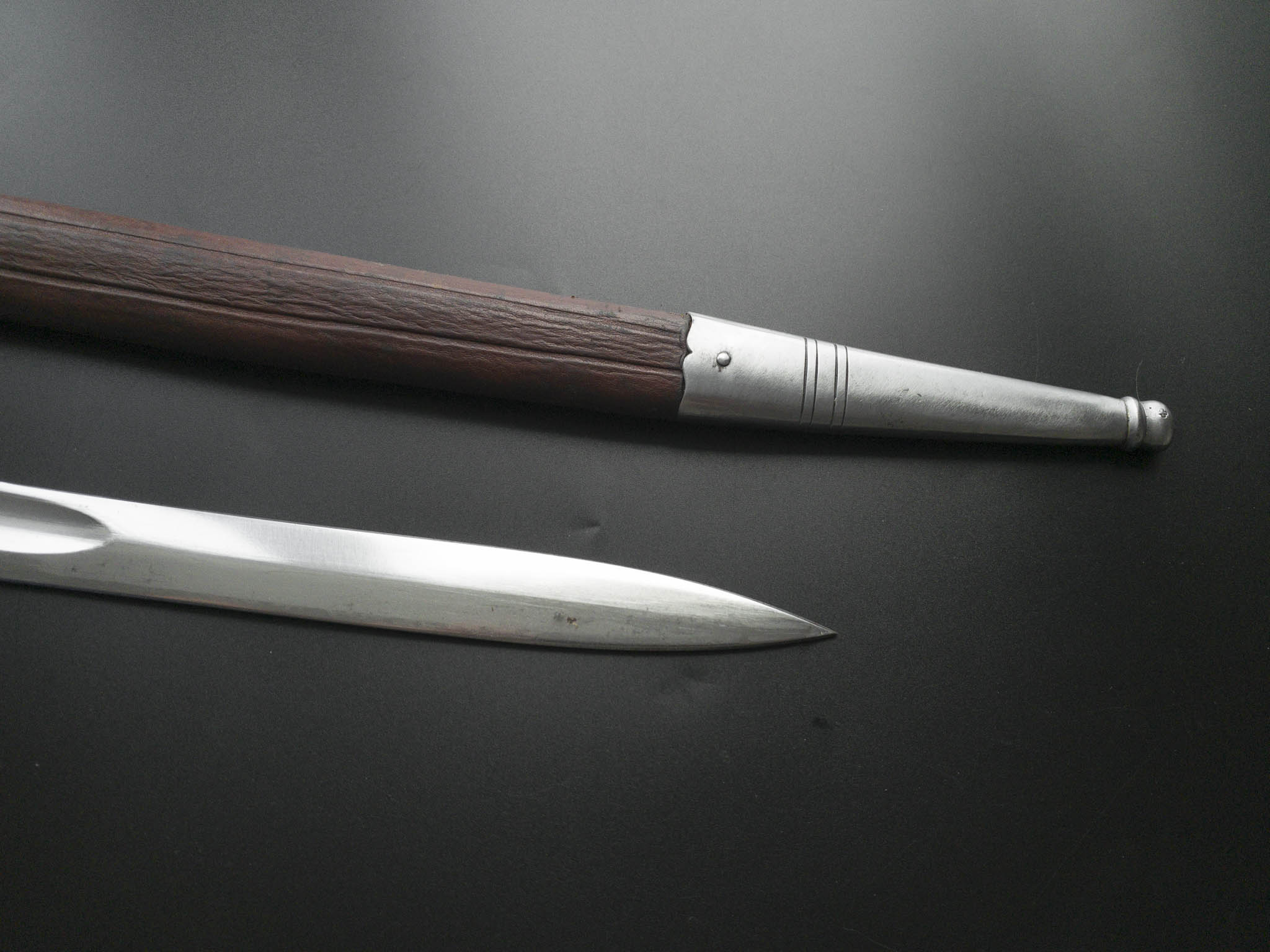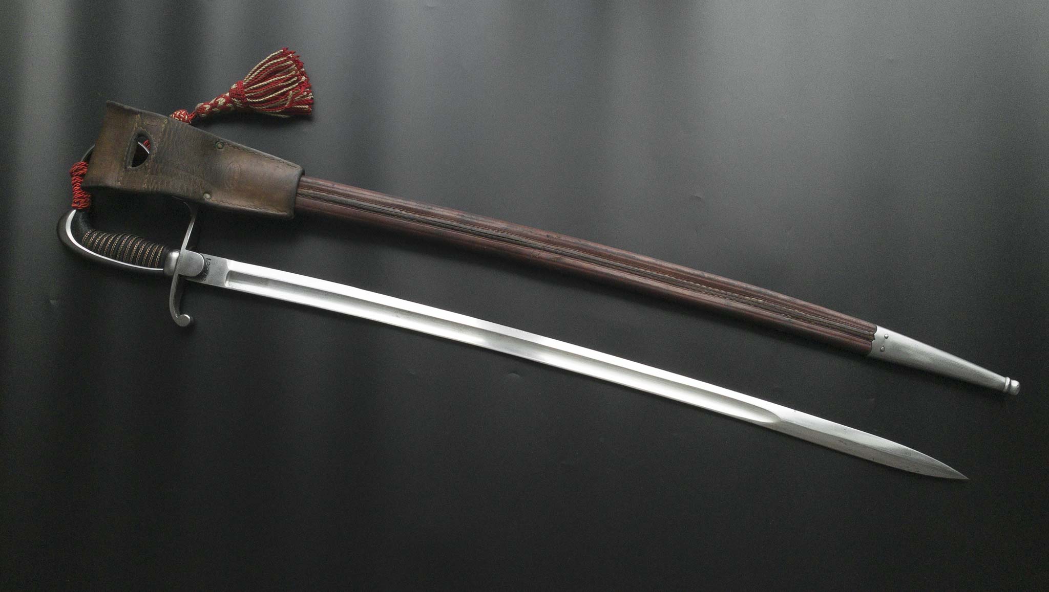 Ножны деревянные, обтянуты коричневой кожей, соответствуют длине и контуру клинка. Прибор ножен состоит из устья со скобой для подвеса, а также наконечника. На устье ножен иметься клеймо производителя.
