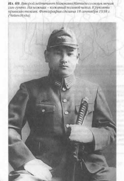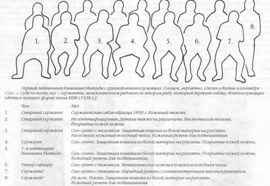Изучение фотографий того времени свидетельствует о том, что син-гунто носили (по крайней мере иногда) и военнослужащие ниже унтер-офицерского ранга. Так, на снимках до 1941 г. с этим мечом можно увидеть старшин, ефрейторов, сержантов и старших сержантов. Сомнительно, чтобы это практиковалось повсеместно, так как в 1935 г. для сержантского состава был введен свой вариант син-гунто массового производства с алюминиевой рукоятью. До этого военнослужащим такого ранга, по-видимому, полагалась только пехотная сабля для сержантского состава образца 1899 г. Вполне вероятно, что до 1935 г. (а может быть, и после) наиболее состоятельные представители младших армейских чинов имели право выбора и могли покупать офицерские син- гунто вместо предписанной уставом модели. Можно, конечно, предположить, что при определенных обстоятельствах и солдаты, и ефрейторы носили син-гунто по приказу, по крайней мере в конце 1930-х гг., но это — всего лишь гипотеза.