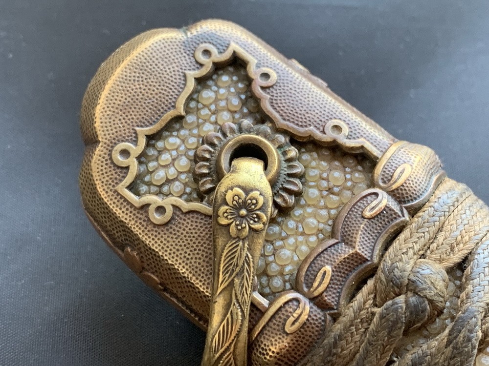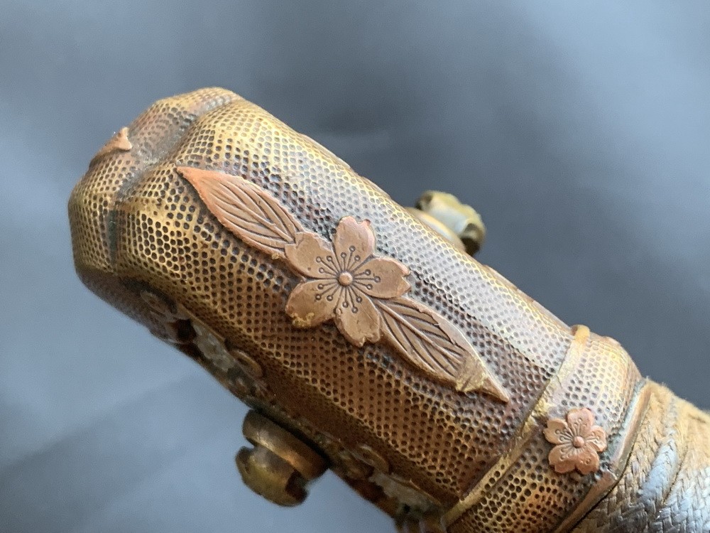 Гарнитура рукояти латунная. Она состоит из набалдашника (кабуто-ганэ) и муфты (фути), выполненных в технике литья и декорированных рельефным изображением цветов вишни (сакуры) и листьев. Мотивы выступают на фоне фактурной поверхности, обработанной в стиле точечной гравировки, т.е. сплошь покрытой крохотными ямками. Окончательная отделка предусматривает нанесение на поверхность коричневой антикоррозийной патины. Края каждой грани и фигурный профиль подчеркиваются позолоченной кромкой. Кабуто-ганэ имеет сквозное отверстие, куда вставляется своеобразный «металлический рукав», через который пропускается декорированная латунная петля (сарутэ) для прикрепления темляка. Концы втулки по обеим сторонам рукояти оправлены розеткой с зубчатыми краями. Как правило, эти розетки являются интегральной частью кабуто-ганэ. Обычный декор сарутэ — цветы вишни.
