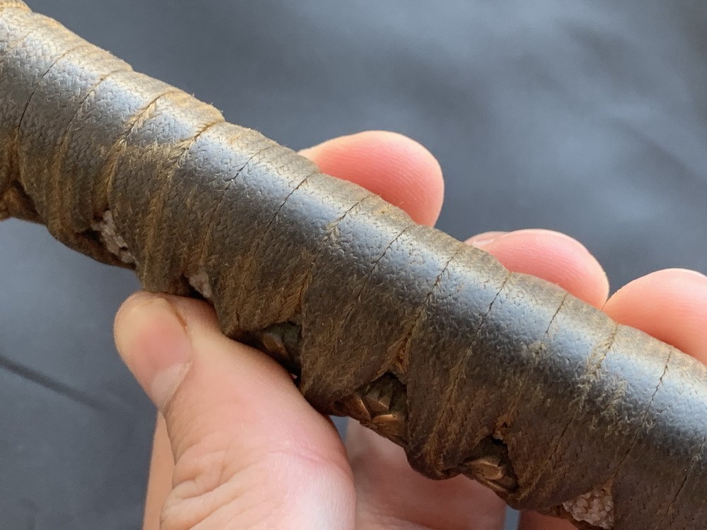 Рукоять обмотана коричневой тесьмой в стиле, типичном для традиционного меча катана. Узел обмотки располагается либо около кабуто-ганэ, либо проходит через край набалдашника. Деревянная основа покрыта белой кожей ската (самэ). На обеих сторонах рукояти под тесьмой имеются штампованные украшения из позолоченной латуни или меди, называемые «мануки».