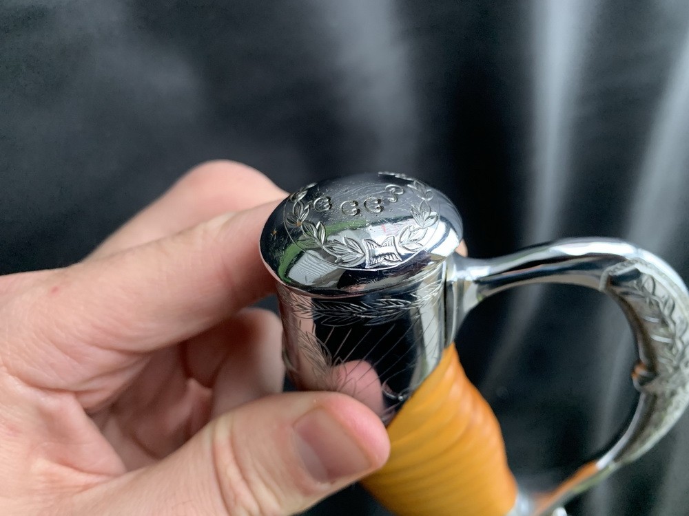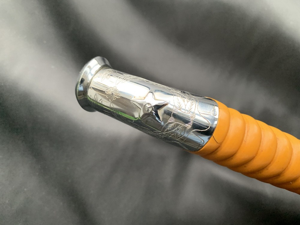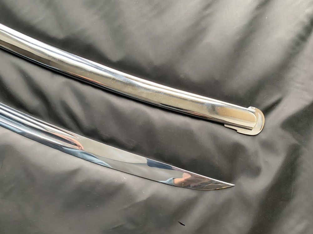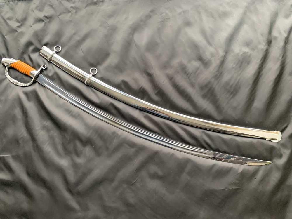 Клинок стальной, незначительной кривизны, однолезвийный, с одним широким и двумя узкими долами,на хвостовике клинка нанесен год 1941.