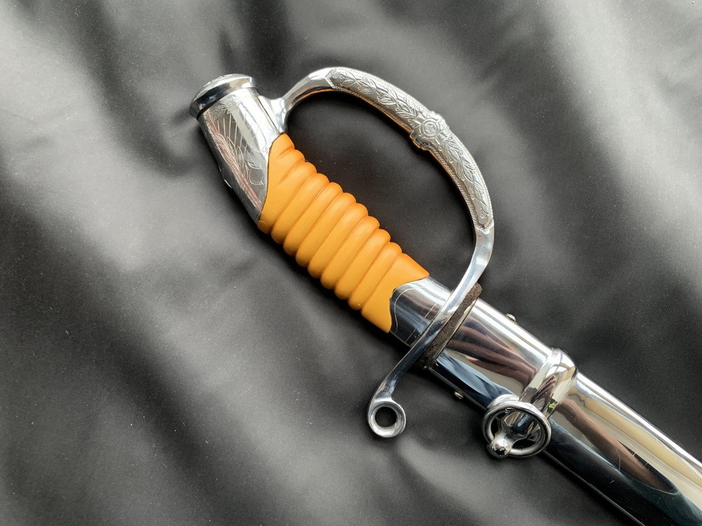 Эфес состоит из рукояти и стальной гарды. Рукоять из желтой пластмассы (неолейкорит) различных оттенков, с поперечными желобками. На верхней стальной втулке рукояти выпуклое изображение пятиконечной звезды и гравированное изображение венка и расходящихся лучей. Головка рукояти овальная выпуклая. Сверху на головке выгравированы буквы «СССР». Нижняя стальная втулка рукояти фигурная. Гарда образована защитной дужкой, отходящей от верхней части рукояти и плавно переходящей в крестовину. Конец крестовины имеет отверстие для темляка, слегка загнут вниз и закруглен. Дужка украшена гравированным растительным орнаментом. Все металлические части эфеса хромированы.