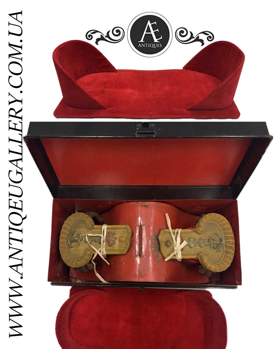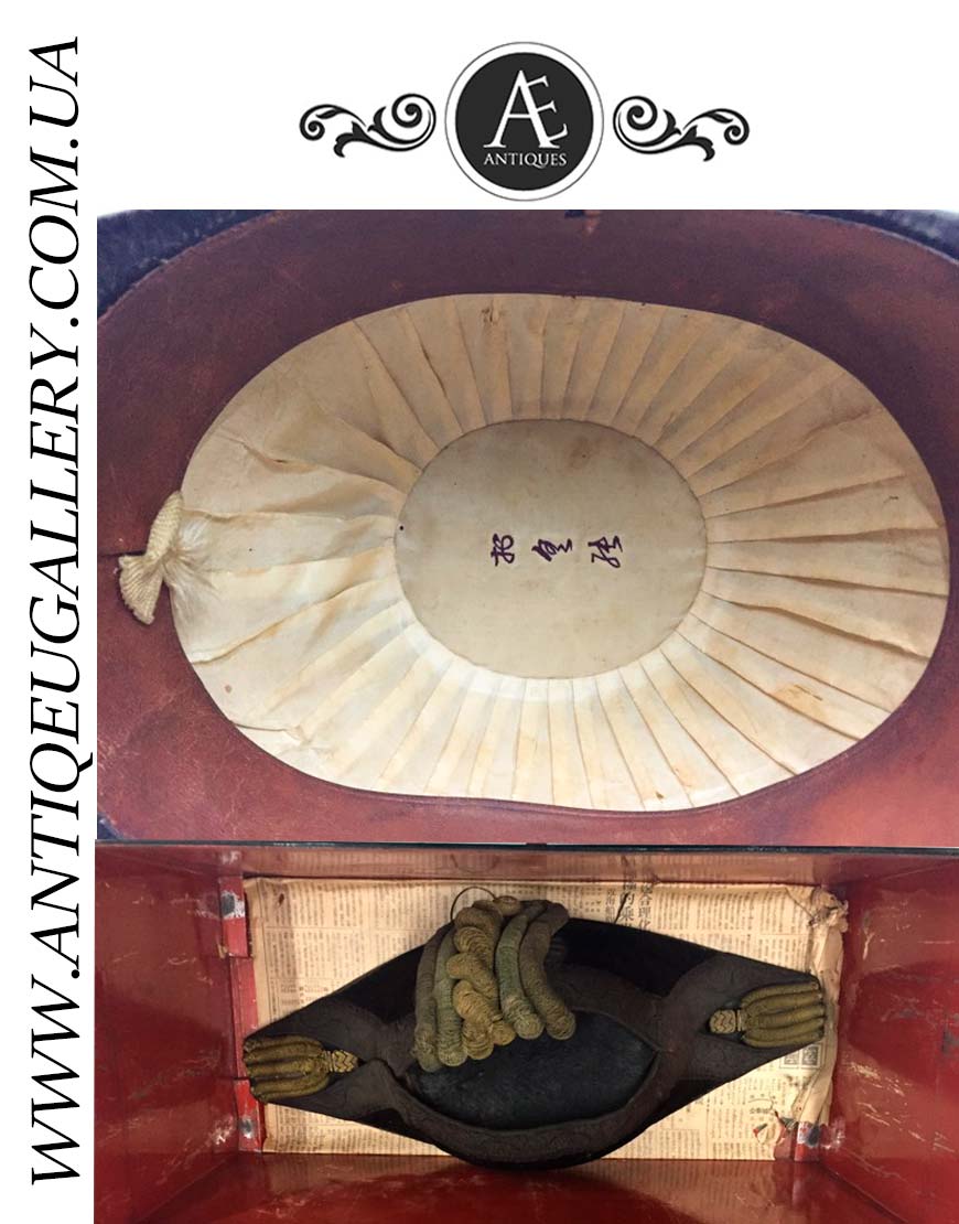 Описание: Парадный морской комплект состоит из треуголки и эполет, помещенных в металлический ящик в брезентовом чехле. Принадлежал капитану 2 ранга, служившему на море, а не на суше (на это указывает павловния). Имя офицера Ямада (что в дословном переводе означает Каменное Поле). Это имя написано и на металлическом ящике и дублировано на брезентовом чехле.