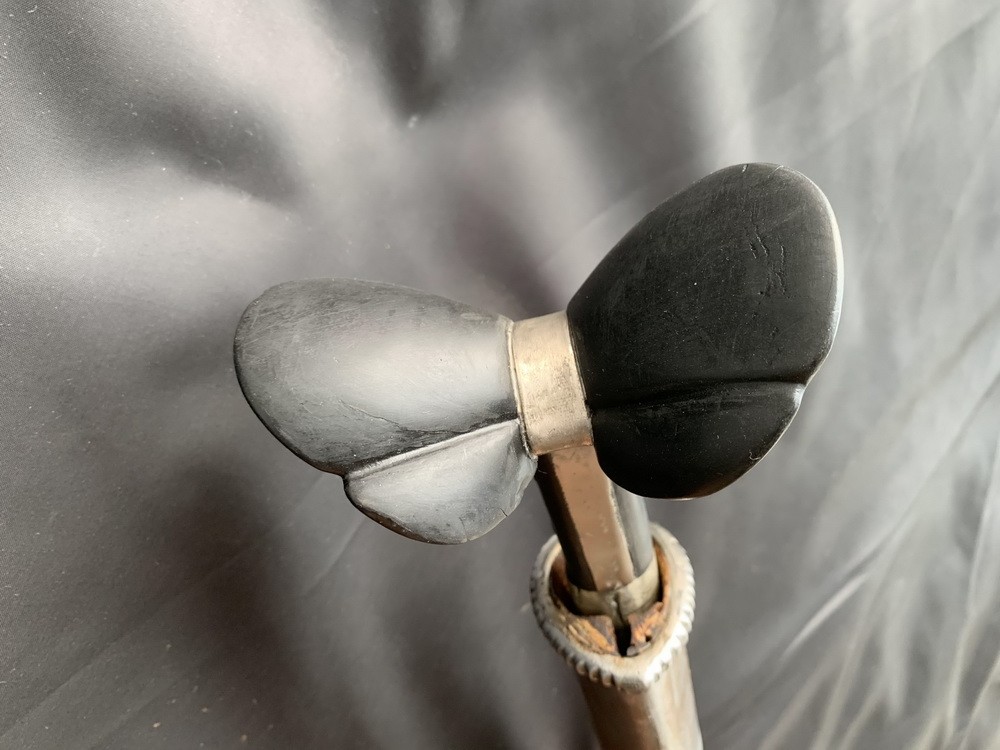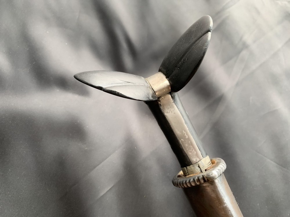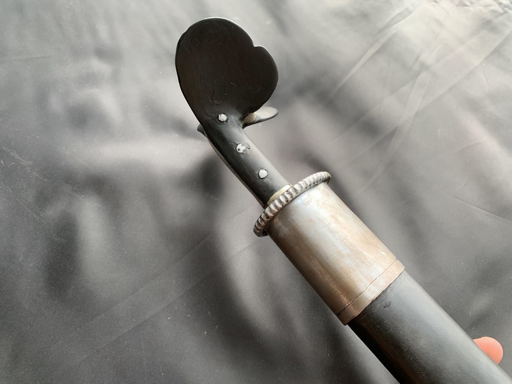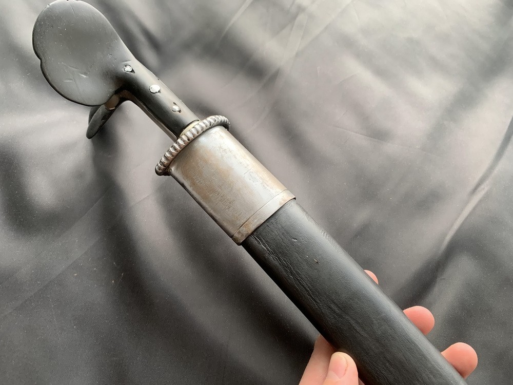 Рукоять состоит из двух деревянных пластин-щечек черного цвета, обе пластины расширяются кверху и выступают над окладом, придавая рукояти форму берцовой кости крупного животного. Щечки рукояти крепятся к хвостовику тремя сквозными металлическими заклепками, в нижней части щечки рукояти плотно обхватывает обоймица – металлическое кольцо, скрепляющее рукоять с клинком. На обоймице есть четыре декоративными полосы. В средней части рукояти между ушами и хвостовиком находится оклад – железная пластинка.