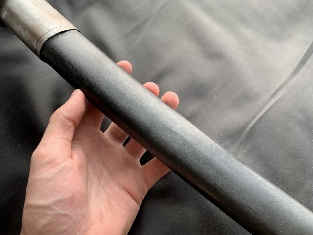 Ножны металлические обтянуты кожей (кожа перетянута). Прибор ножен имеет рельефный ободок и тонкую декоративную линию.