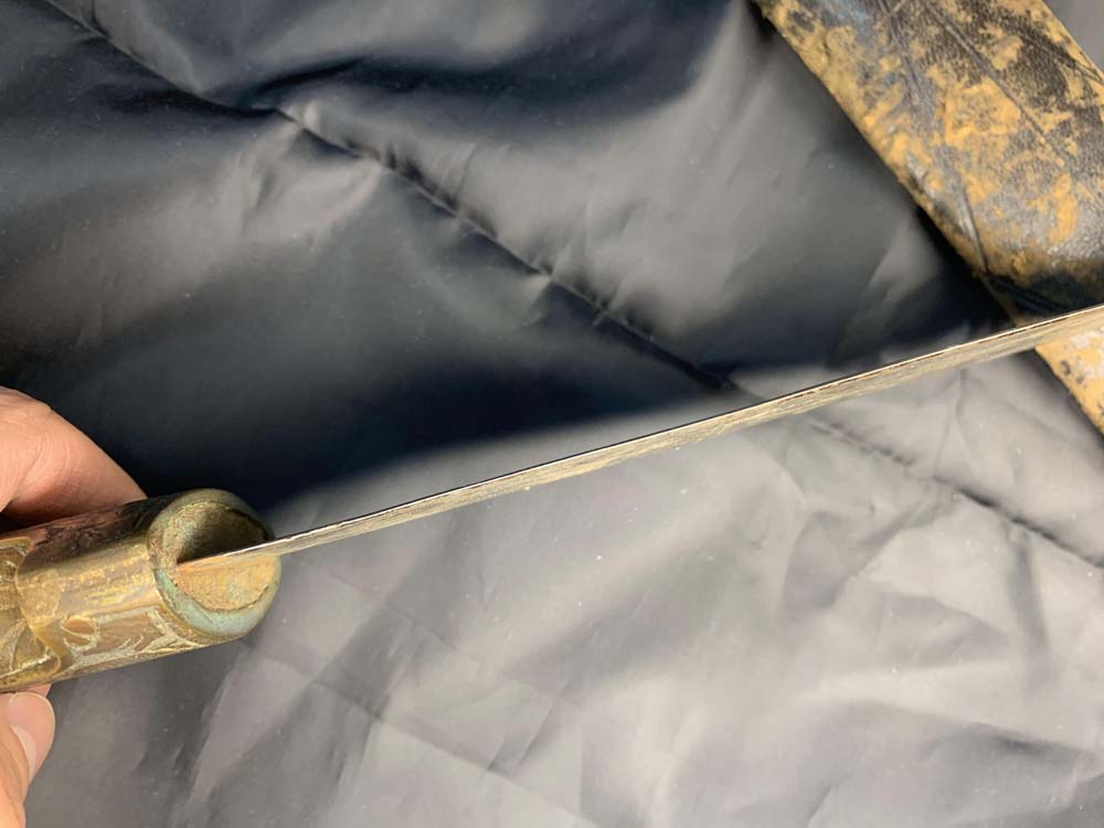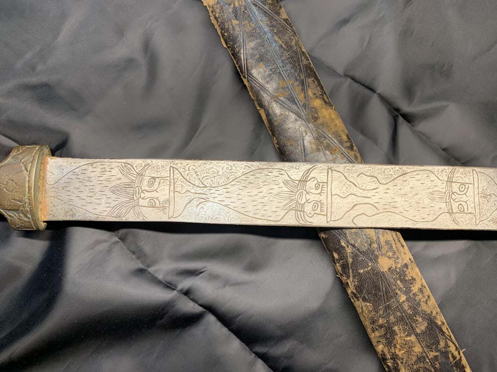 Большой церемониальный восточный меч в классической его форме с прямым тонким клинком. На клинке нанесены местные рисунки и надписи