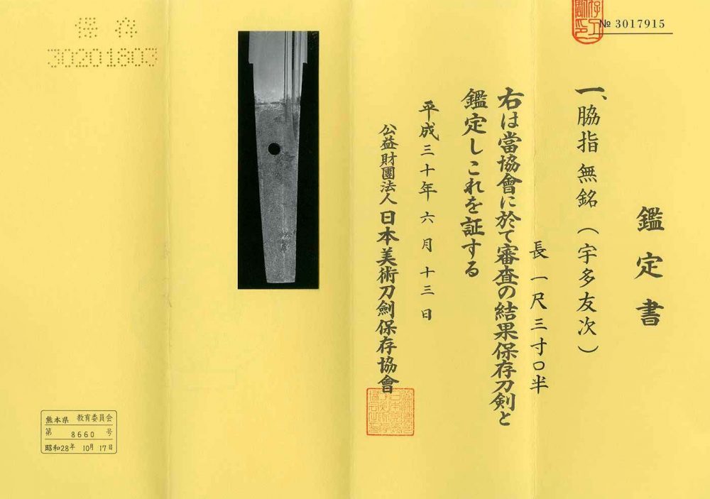 Изготовитель и датировка: клинок без подписи (無名, мумэй), работы мастера Уда Томотсугу (友次, 1504-1521).