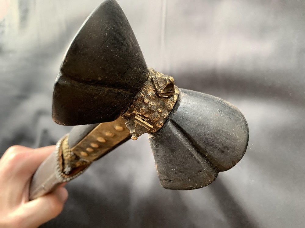 Рукоять состоит из двух деревянных пластин-щечек черного цвета, обе пластины расширяются кверху и выступают над окладом, придавая рукояти форму берцовой кости крупного животного. Щечки рукояти крепятся к хвостовику тремя сквозными латунными заклепками, в нижней части щечки рукояти плотно обхватывает декоративная обоймица – латунное кольцо, скрепляющее рукоять с клинком. На обоймице есть рельефные узоры. В средней части рукояти между ушами и хвостовиком находится оклад – латунная пластинка с рельефным узором и геометрические фигуры.